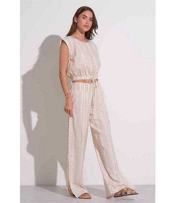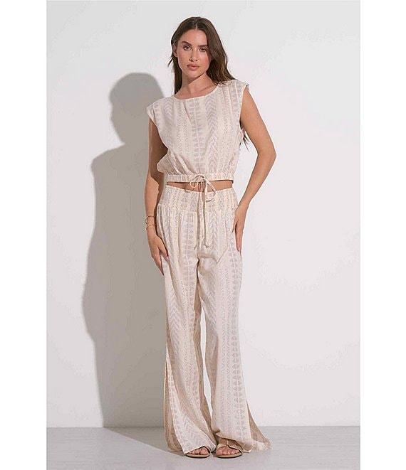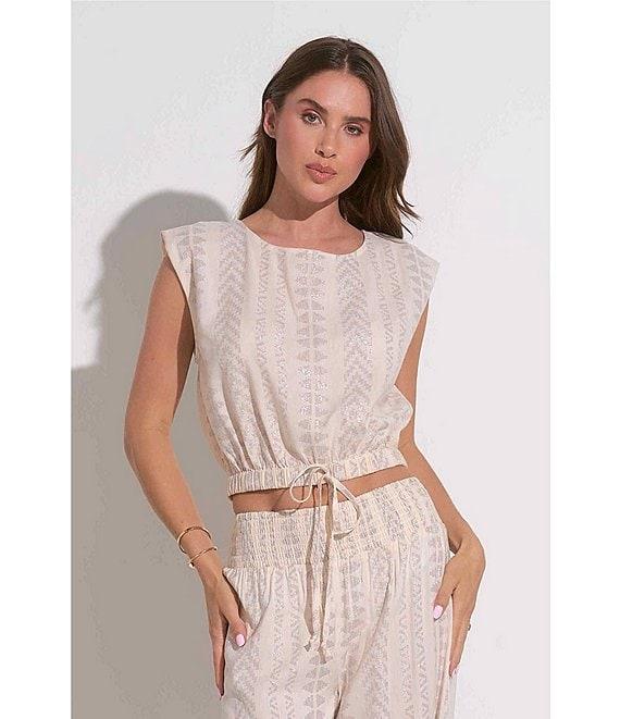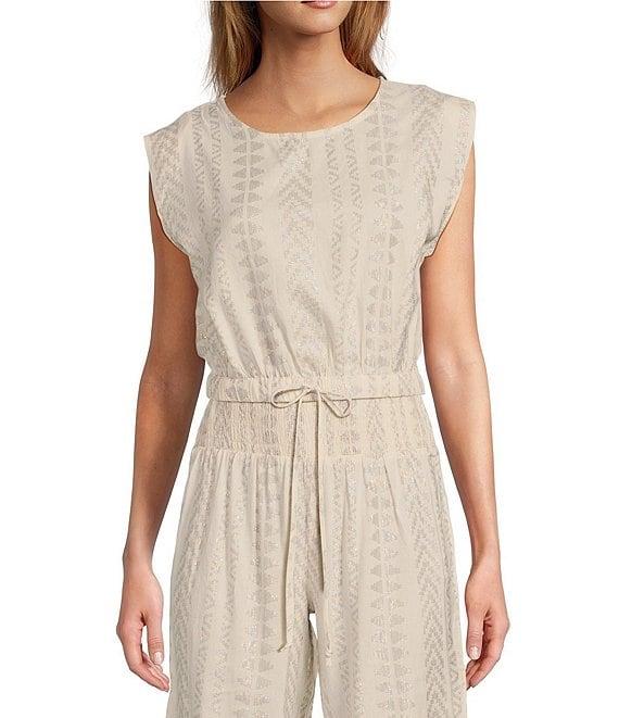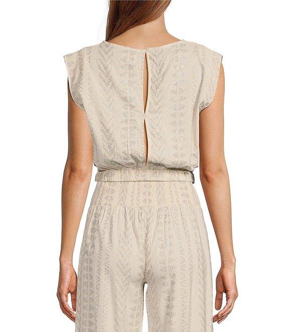 From ELAN, this top features: Intertwined metallic fabrication Crew neckline Cap sleeves Cropped length Elasticized banded hemline Self-tie detailing Pullover construction Approx. 18.5" length Cotton/viscose/metallic; unlined Hand wash cold/lay flat to dry Imported.