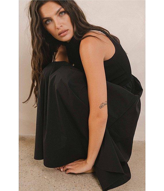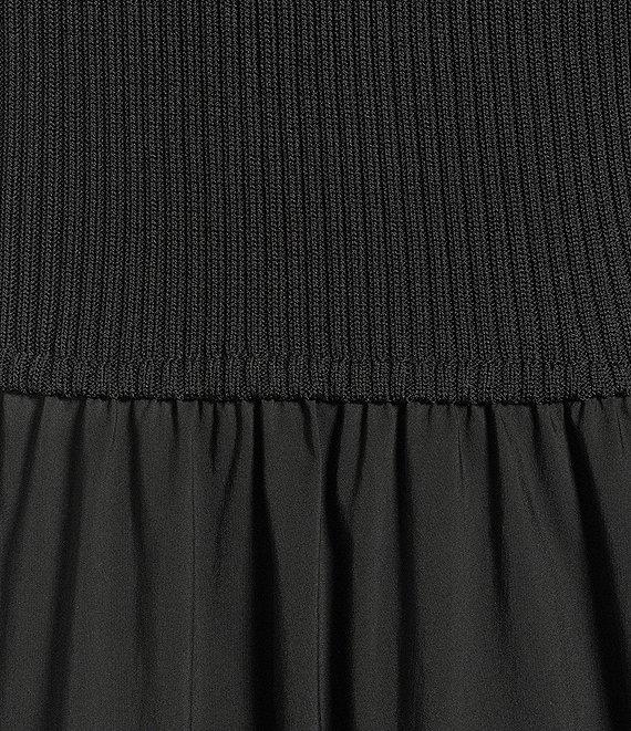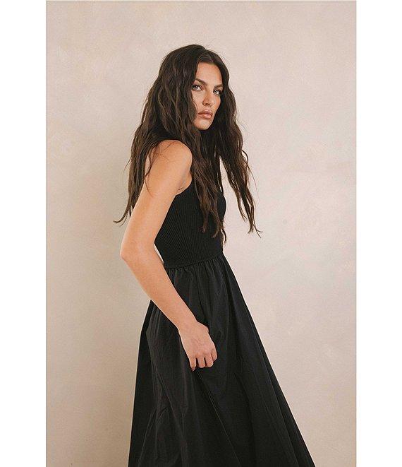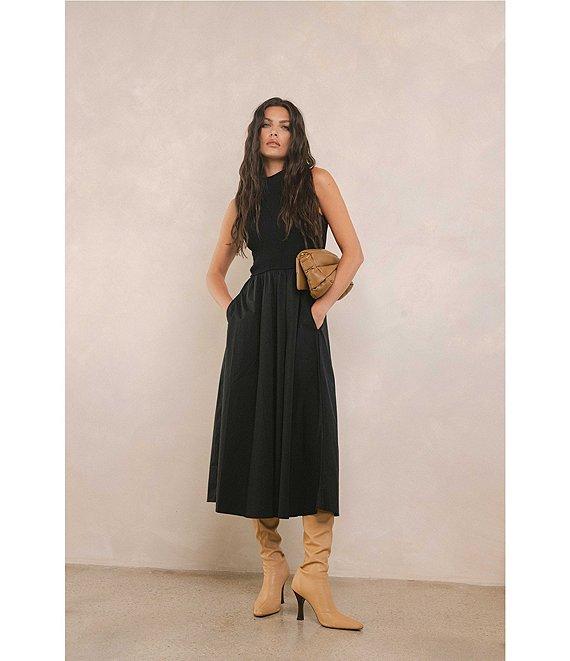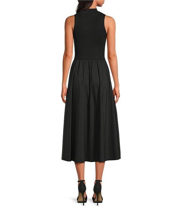 From ELAN, this midi dress features: Mix media fabrication Knit bodice/ woven skirt Mock neckline Sleeveless Functional side pockets Straight hemline Pullover construction Approx. 50" length Viscose/nylon/cotton/polyamide/spandex Hand wash Imported.