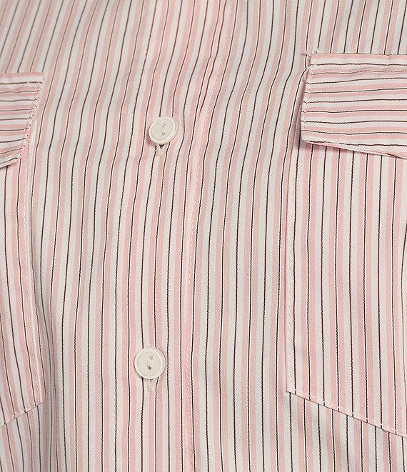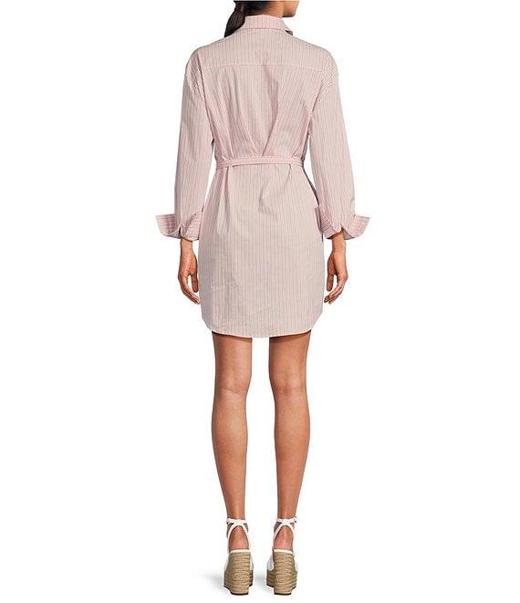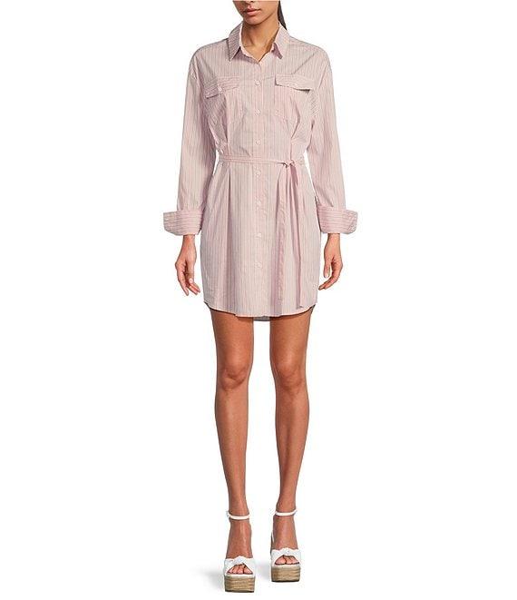 From ELAN, this dress features:Woven fabricationShirt dress silhouetteStripe print Point collar neckline Long sleeves with button cuffsTwo chest pocketsSelf tie beltStandard fit Shirttail hemline Button front closure Approx. 35" lengthCotton/polyamide/spandexHand washImported.