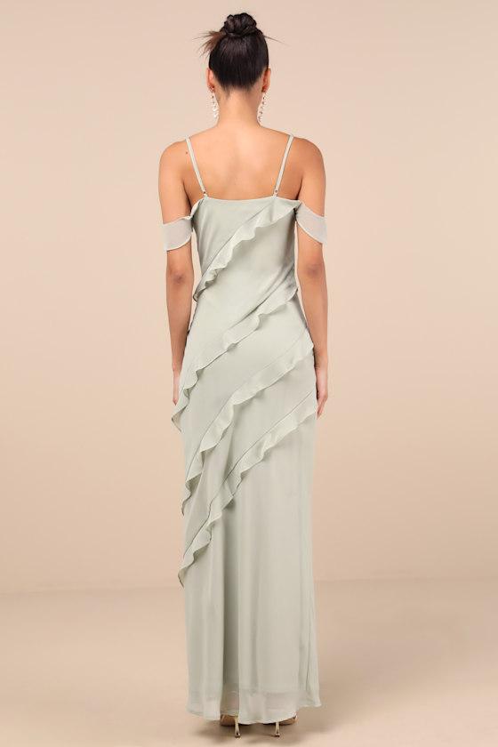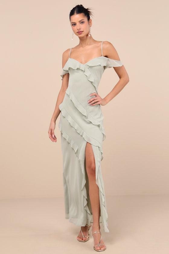 A crowd-pleaser like the Lulus Elara Light Sage Ruffled Maxi Dress will have you effortlessly impressing everyone you meet! This ethereal dress has an airy chiffon construction that shapes a V-neckline and ruffled, cold-shoulder cutouts supported by adjustable spaghetti straps. The figure-skimming silhouette boasts additional ruffled trim as it falls to a sweeping maxi hem with a flirty side slit. Hidden side zipper/clasp.