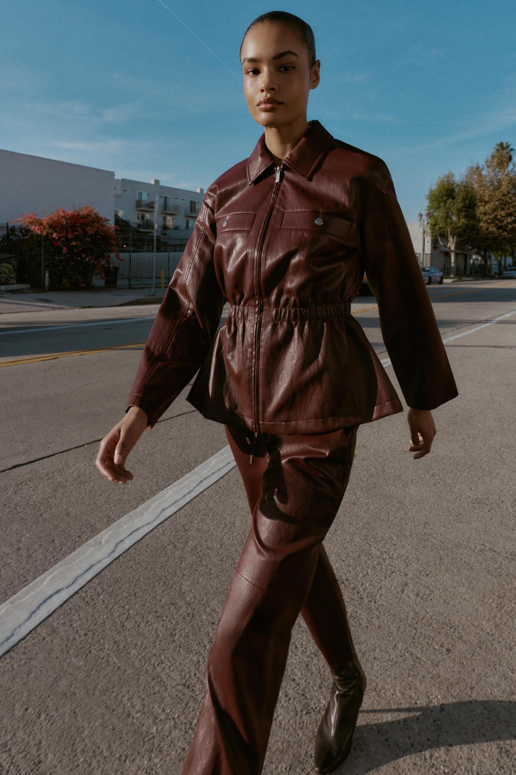 Brown Faux Leather Mottled Texture Belted Hem Biker Jacket