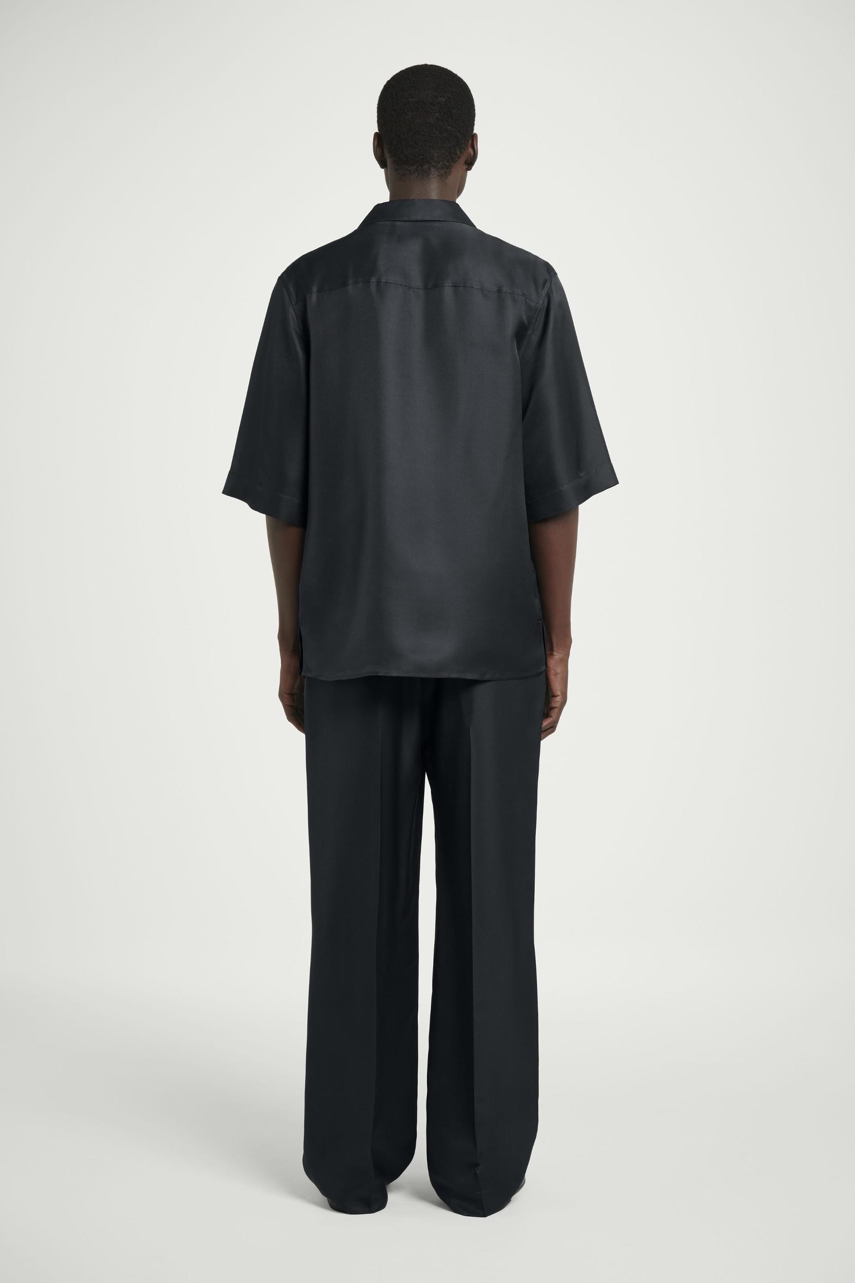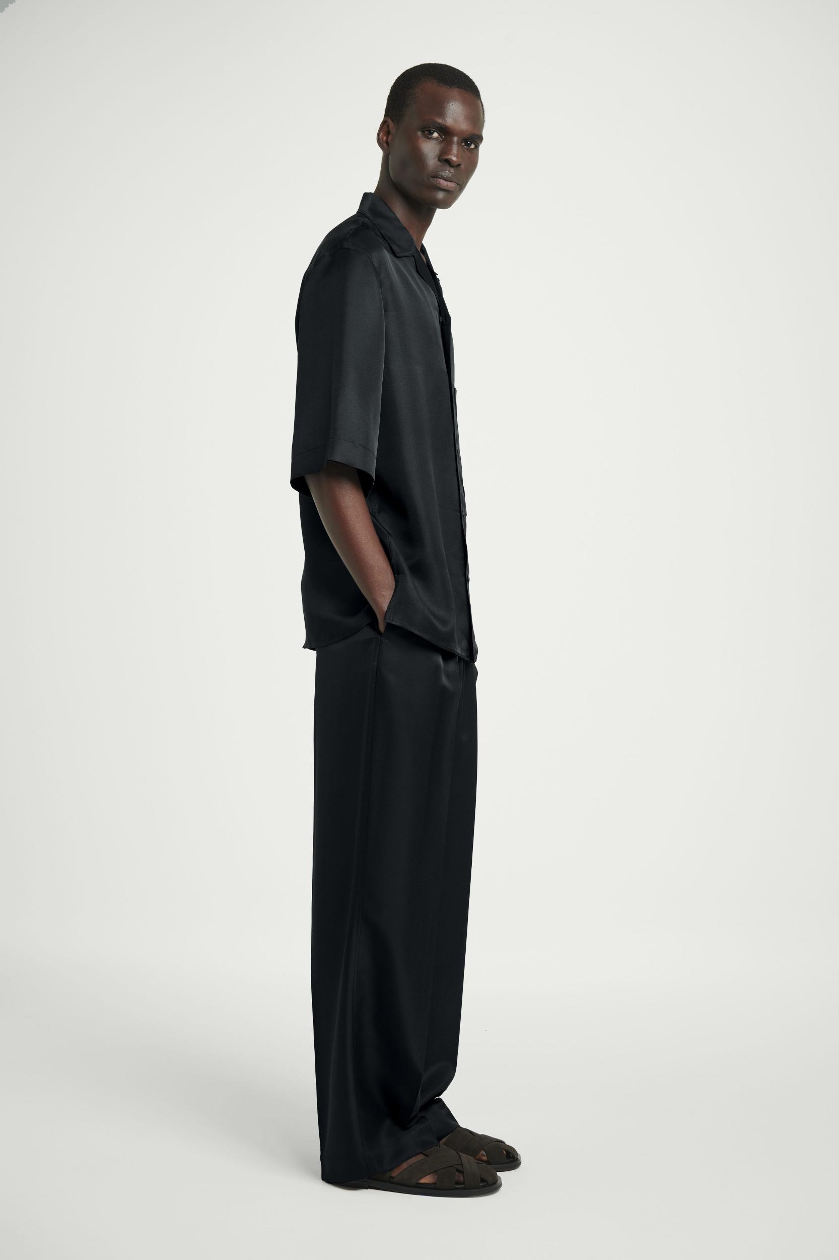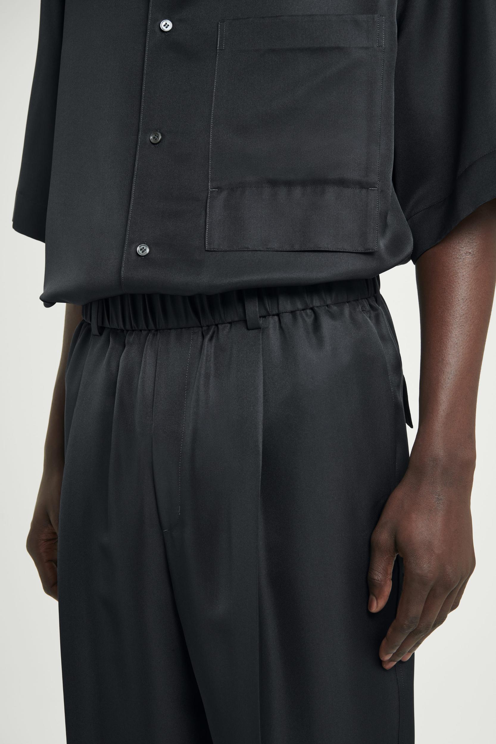 The COS SS25 runway collection builds on the house codes of lasting design and exceptional craftsmanship. Offered in an enduring anthracite tone, these polished elasticated trousers are made from a 100% mulberry silk cloth, selected for its effortlessly relaxed drape, shaped with slightly tapered legs that break at the shoe. Style them as a coord with the matching shirt. Relaxed fit Shell: 100% Mulberry silk. Lining: 100% Cotton. Excluding trims / Dry clean Inside leg length of size M is 75cm / Model wears a size M