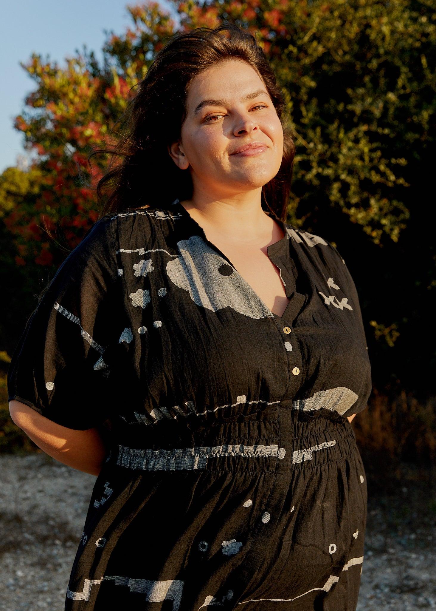 A monochrome hand-detailed midi dress that lets you make a statement with its exquisite abstract motifs handwoven to perfection by inspiring weavers of India. This relaxed-fit dress has a round V-shaped neckline with a button-down front enhanced with an elasticated waist, short sleeves. You can style the dress for laid-back evenings, holidays, or summer soirees.