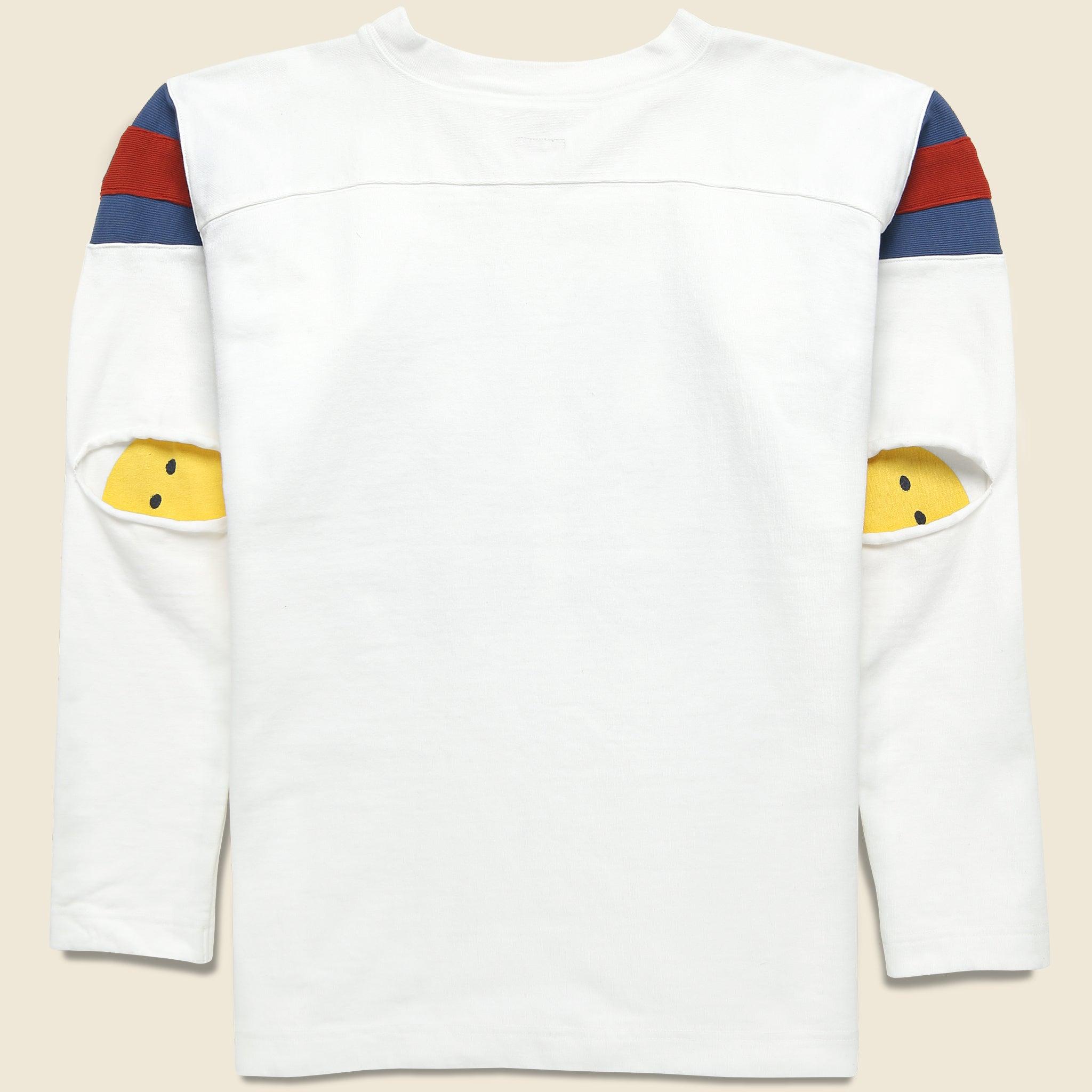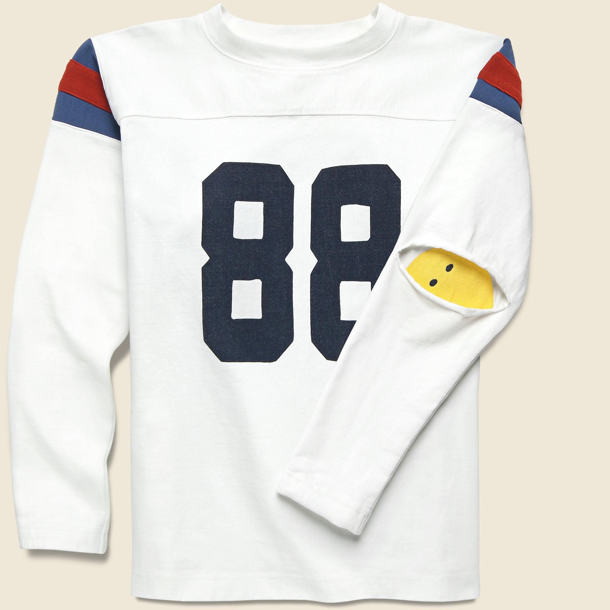 This Football Tee from Kapital is made from a special high-density cotton jersey that’s printed with a retro collegiate block number ’88’ across the front and features slit elbows with the brand’s iconic smiley logo patches. It has a relaxed fit that runs true to size and is finished with a ribbed crew neckline and classic striped dropped shoulders for a vintage-inspired look.