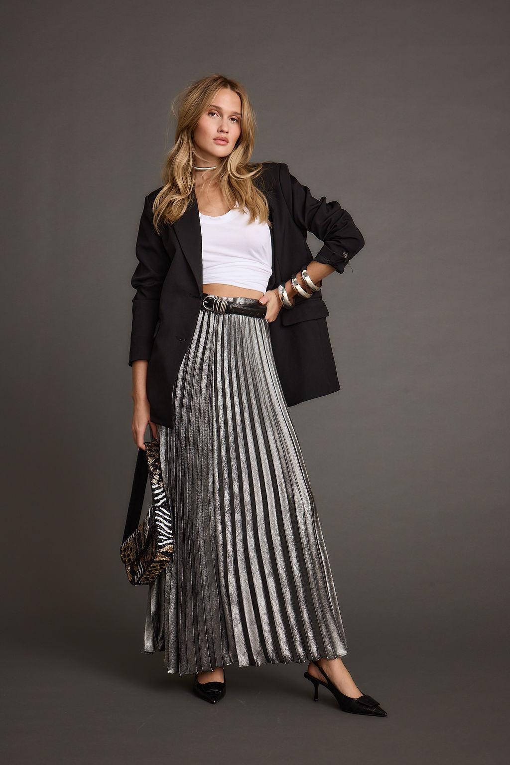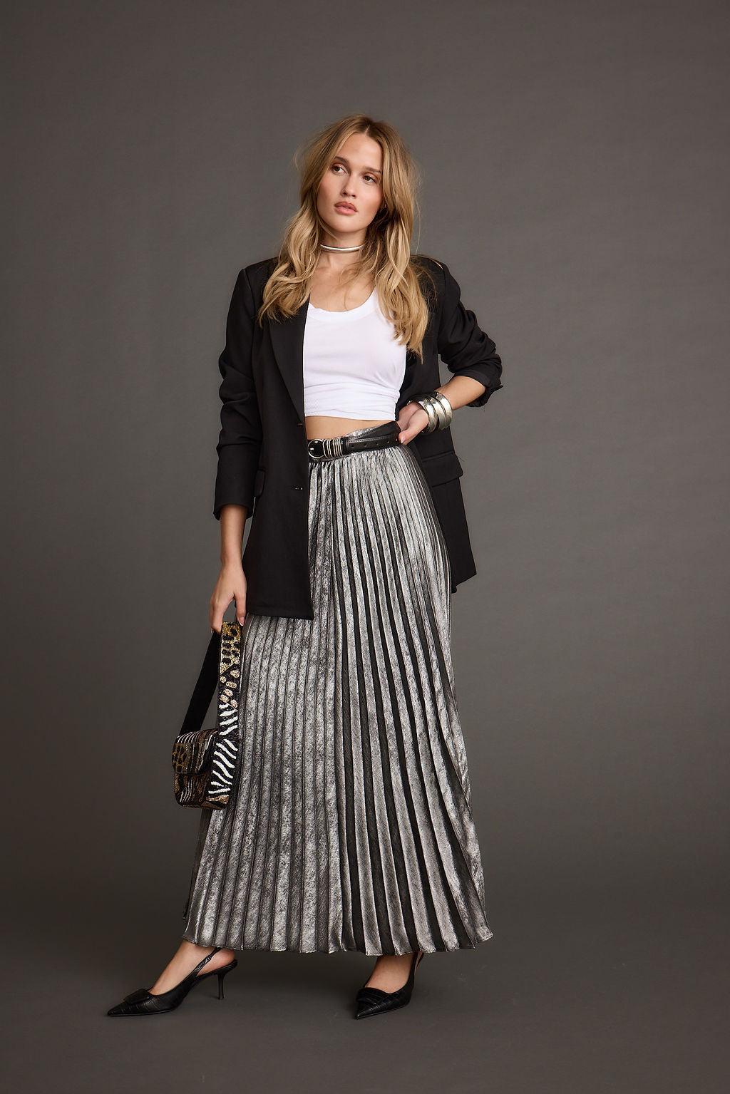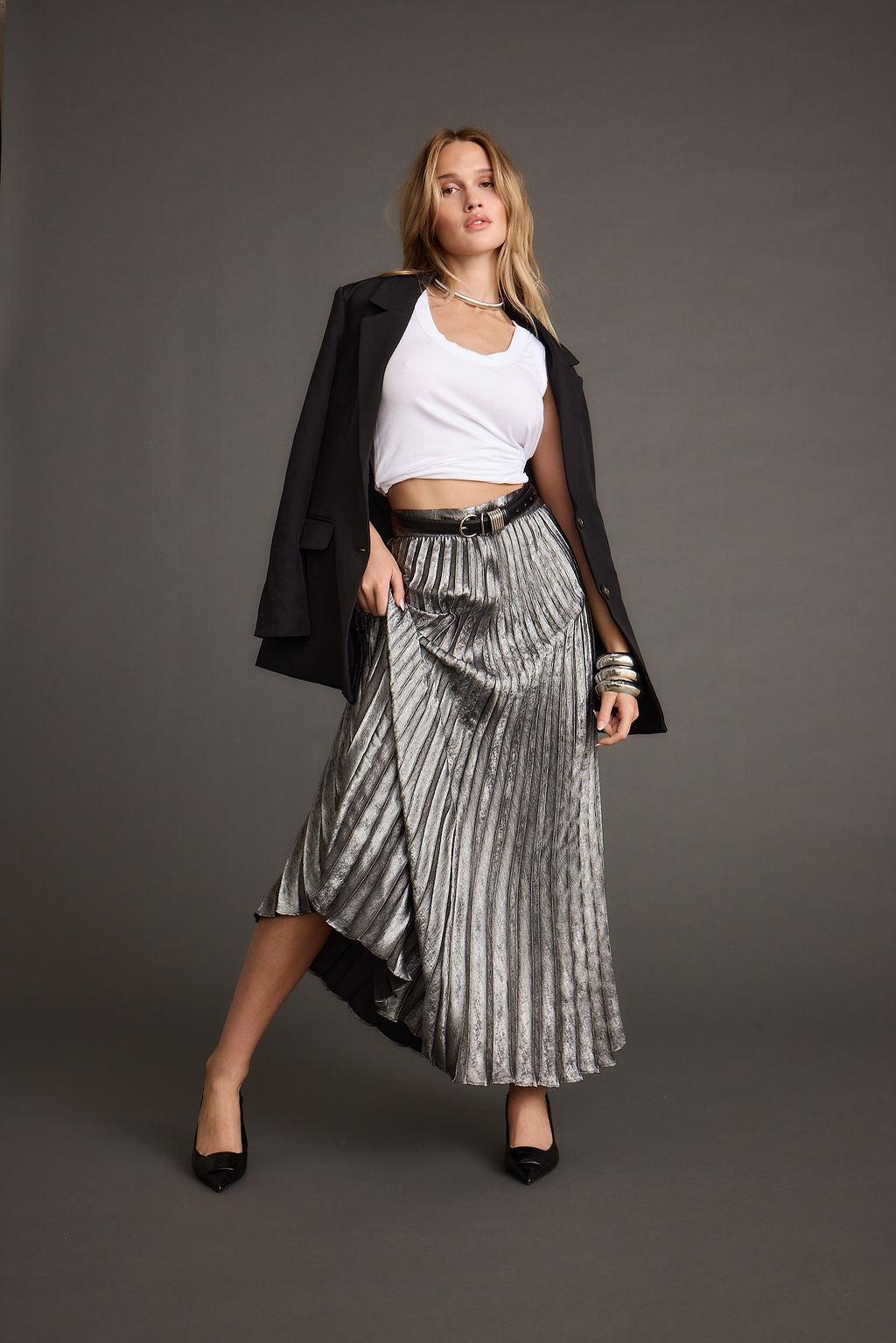 Did someone say party? Add a little bit of sophistication and a whole lot of glam in the Electric Love Gunmetal Metallic Maxi Skirt. Made from a dark grey and silver metallic gunmetal material with elevated pleating, the Electric Love Maxi Skirt is that standout piece that can take you from office party to dinner party with the girls.