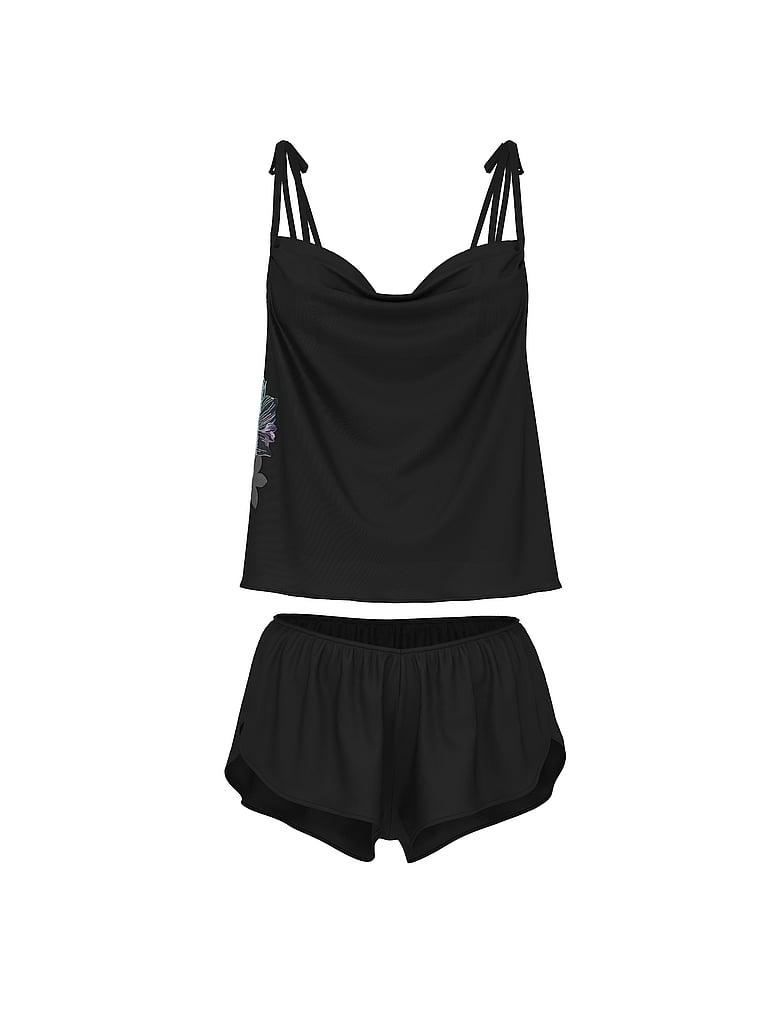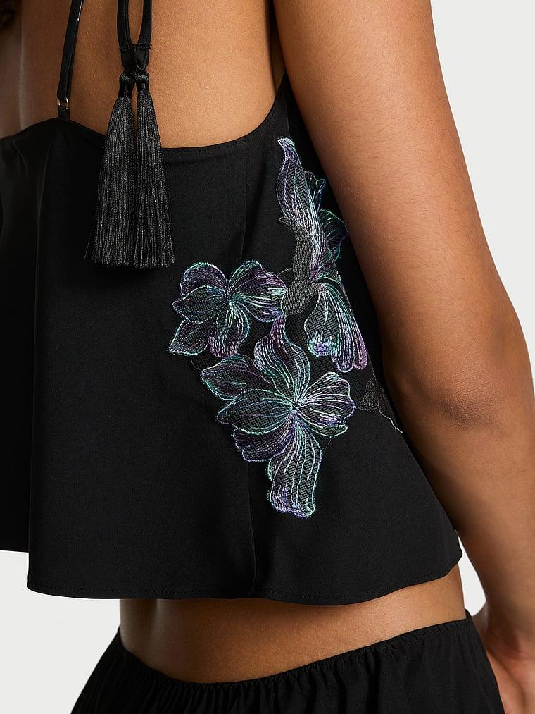 Richly hued, moody blooms are artfully embroidered and perfectly placed on the cowl-neck Camisole, taking this classic Lingerie Set to an elegant new level. Includes Cami and Shorts Draped cowl neckline Noir floral embroidery motif, designed in Europe Adjustable straps Tasseled bow details Shorts with elastic waist Machine wash Imported