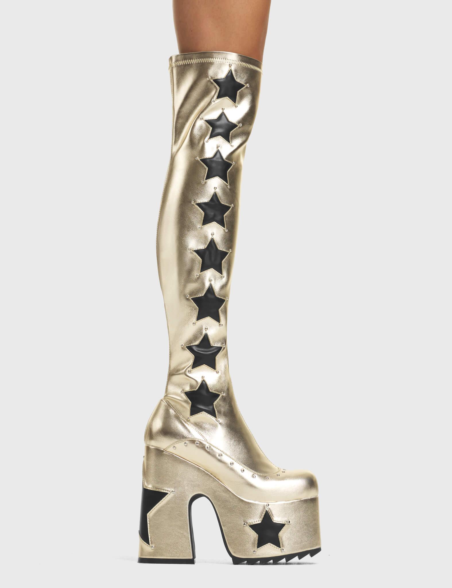 Electricity Chunky Platform Thigh High Boots in Gold. These Platform Boots feature Black stars running up the outside leg on a Chunky Platform sole. Made with eco-friendly materials and 100% cruelty-free! Platform Height: Black Stars Black Zip Round Toe 100% vegan SKU: LMF 6380 - GoldPU/Black