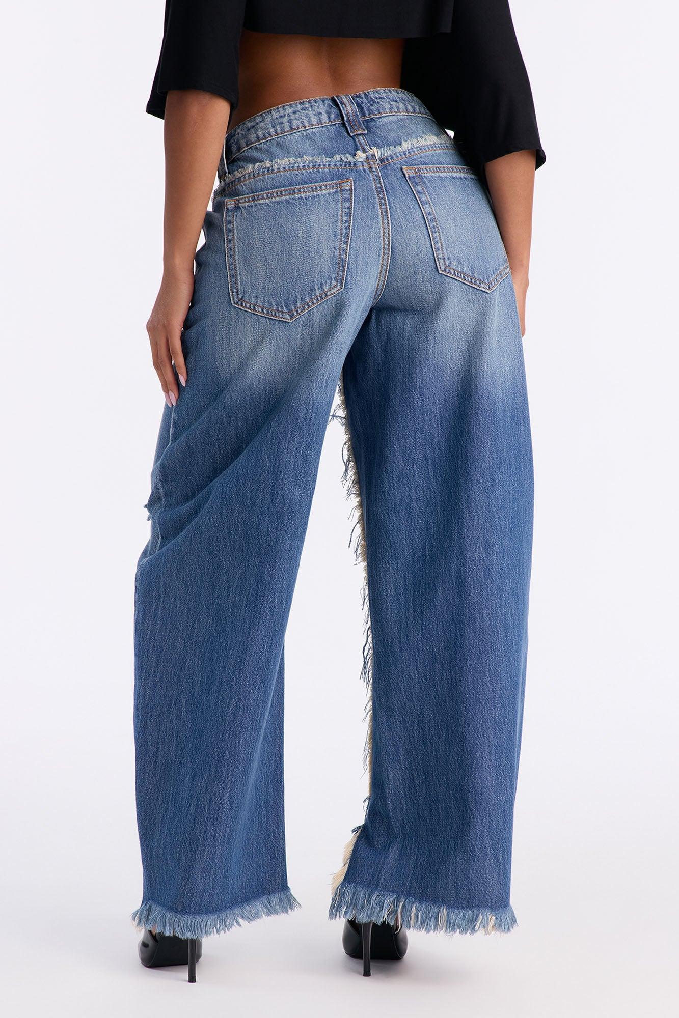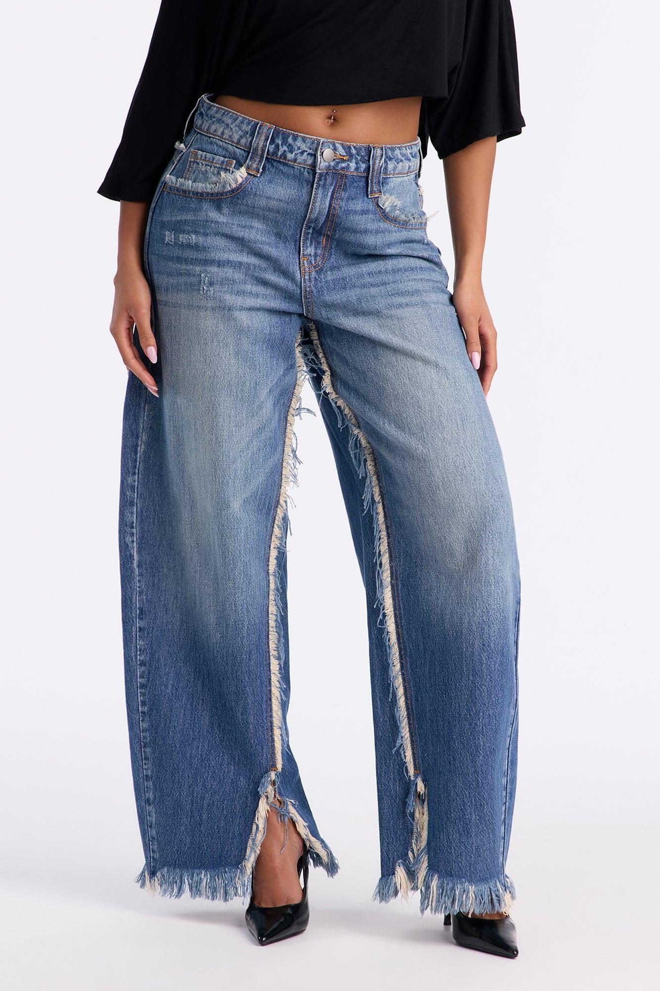 Available In Dark Wash. Barrel Leg Jean 5 Pocket Frayed Details Split Hem 11.5" Rise 30" Inseam Non Stretch Disclaimer: Due To The Distressing Process, Each Garment Is Unique. 100% Cotton Imported