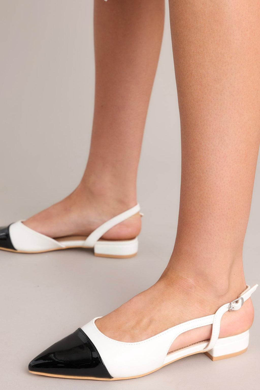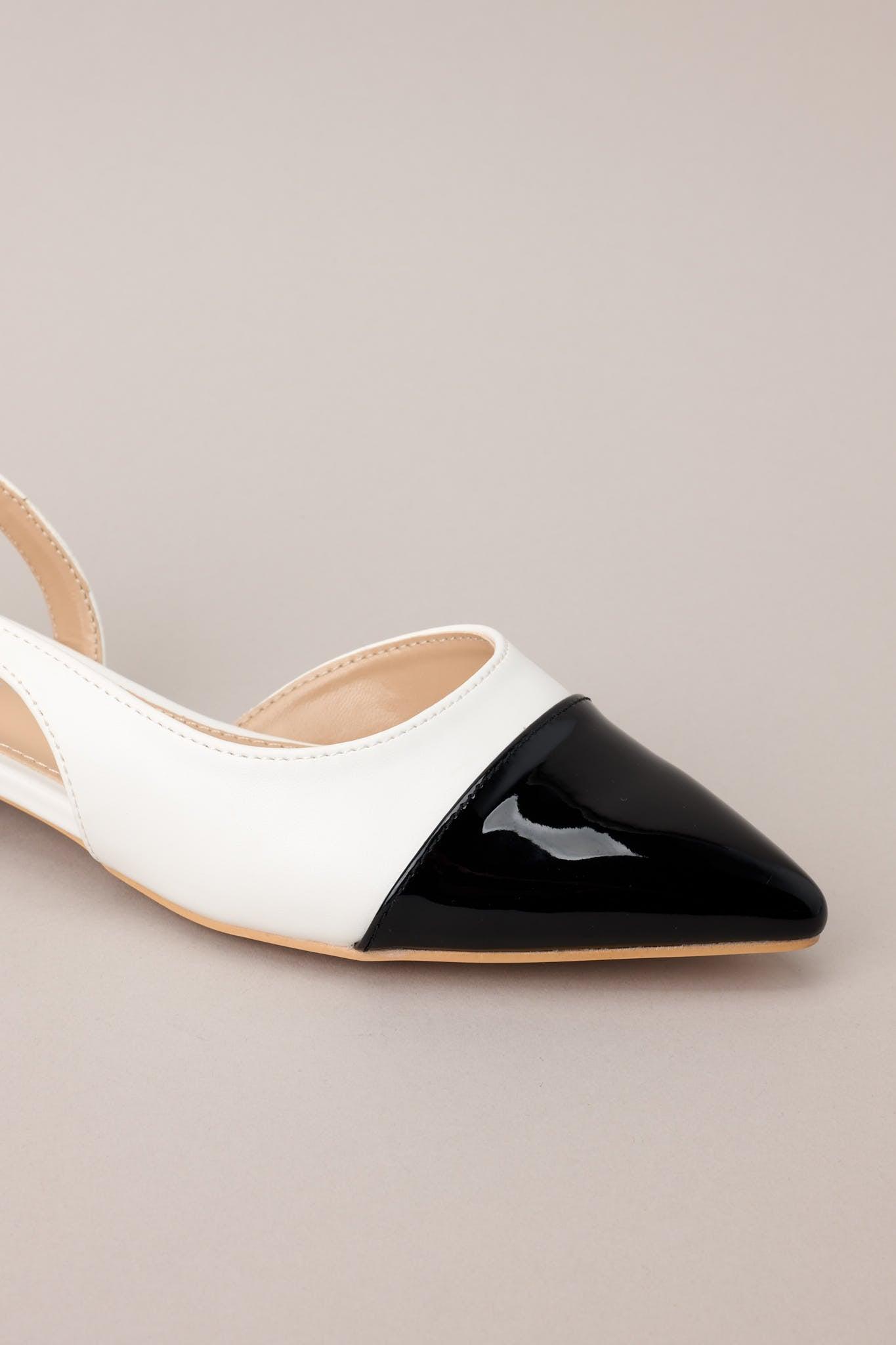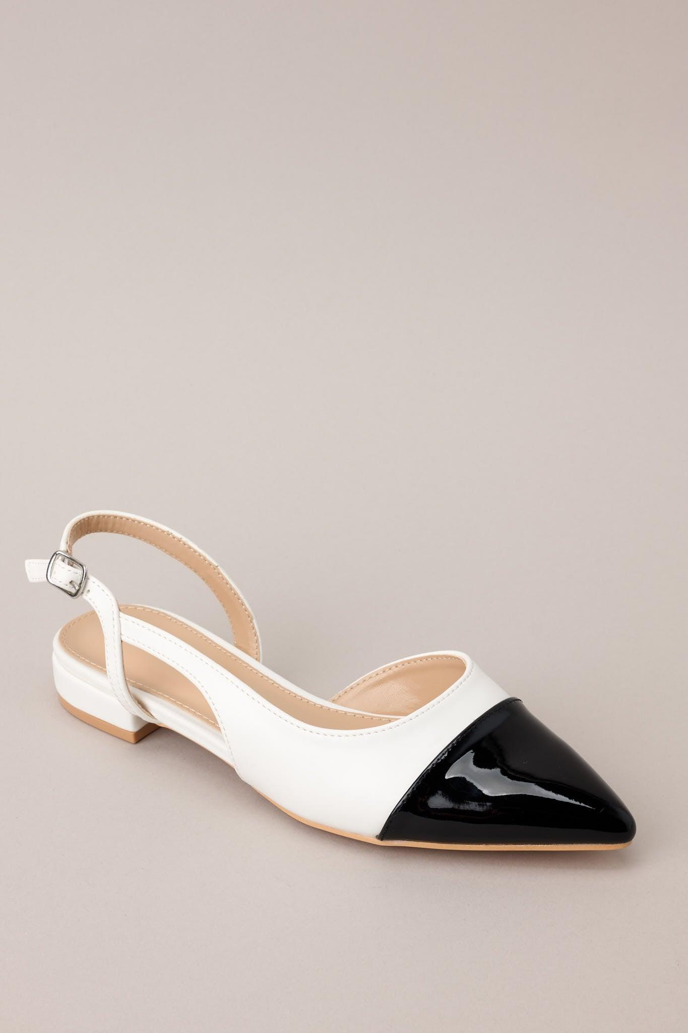 Elevate your style game with these Elegant Equilibrium flats, featuring a sleek black and white design and a comfortable sling back fit. Perfect for day or night, these flats add the perfect touch of sophistication to any outfit. These flats feature a pointed toe, a monochrome pattern, side cutouts, and an adjustable strap.