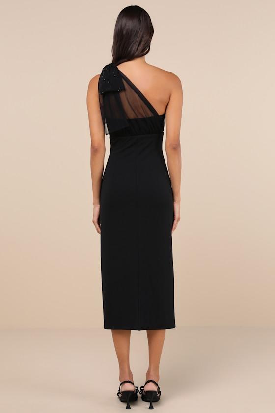 Your aura will be all grace and style in the Lulus Elegant Indication Black Mesh Pearl One-Shoulder Midi Dress! Sheer mesh, with luminous black pearl-inspired accents throughout, shapes a wide, tying shoulder strap that overlays across a techno crepe-knit bodice with bust darts, hidden no-slip strips, and a high, empire waist. Bodycon skirt continues down to a midi hem with a flirty side slit. Hidden zipper/clasp at side.