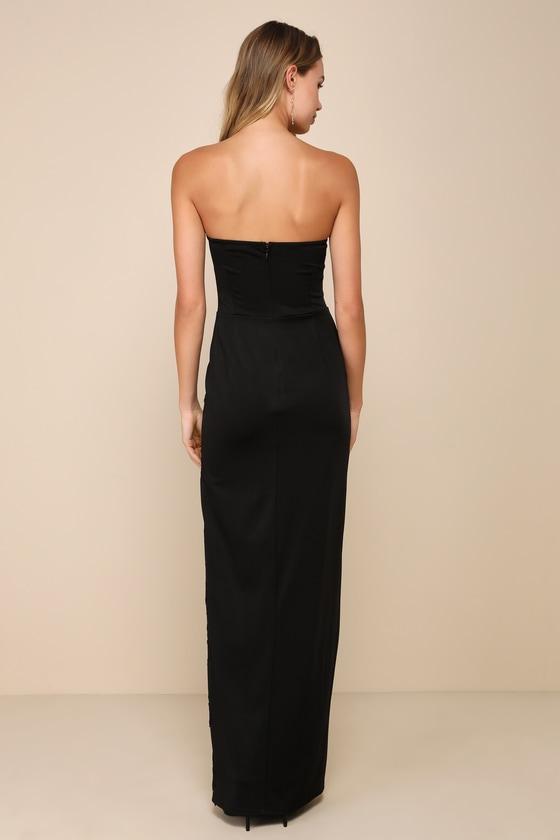 We simply can't resist the luxe vibes of the Lulus Elegant Mood Black 3D Floral Applique Strapless Maxi Dress! This stunning dress has a techno crepe woven fabrication that shapes a strapless neckline (with hidden no-slip strips) and a princess-seamed, sweetheart bodice that sits atop a high, fitted waist. A trim of large, 3D floral appliques adorn the front of the figure-skimming silhouette as it falls to a column maxi skirt with a sultry side slit. Hidden back zipper/clasp.