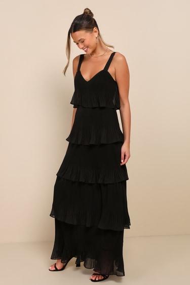 You'll elevate your charming character whenever you slip into the Lulus Elegant Nature Black Pleated Sleeveless Tiered Maxi Dress! Lightweight, pleated woven chiffon shapes a sleeveless bodice, a flirty V-neck (and back), and wide tank straps. The figure-skimming, sheath-style silhouette cascades down to a sweeping maxi hem. Hidden back zipper/clasp.