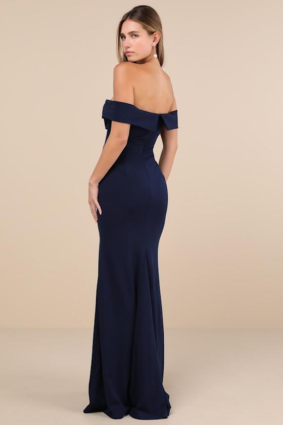 Everyone will see you as the most captivating vision in any room with the Lulus Elegant Perception Navy Blue Off-the-Shoulder Bow Maxi Dress! Stretchy crepe knit shapes this sensational dress that features a princess-seamed bodice adorned with an oversized, bow-inspired detail that creates a fold-over, off-the-shoulder neckline (with hidden no-slip strips), all framed by wide straps. The high, fitted waist tops a figure-flaunting, mermaid-style skirt that falls to a sweeping maxi hem with an ultra-flirty side slit. Hidden back zipper/clasp.