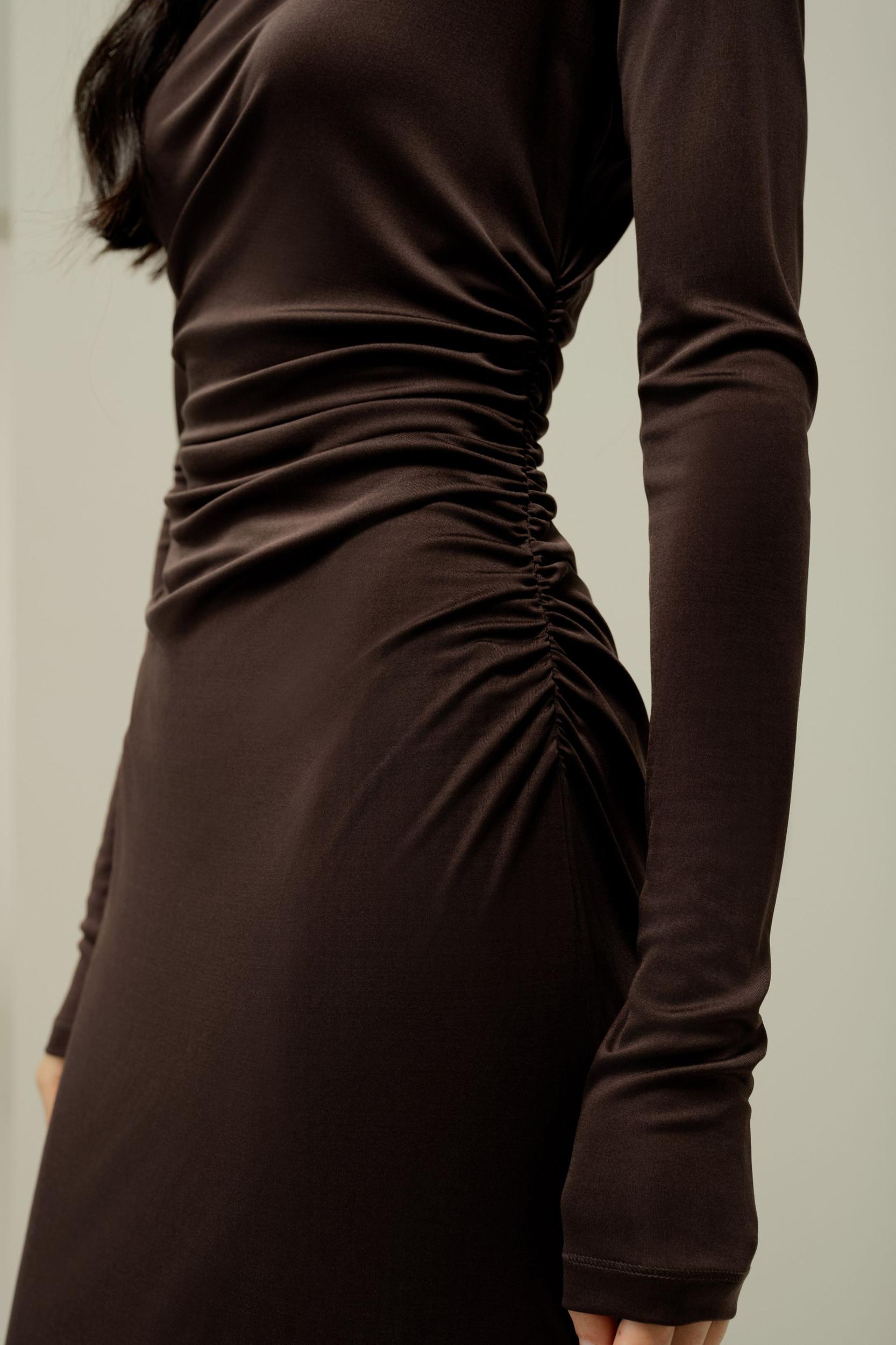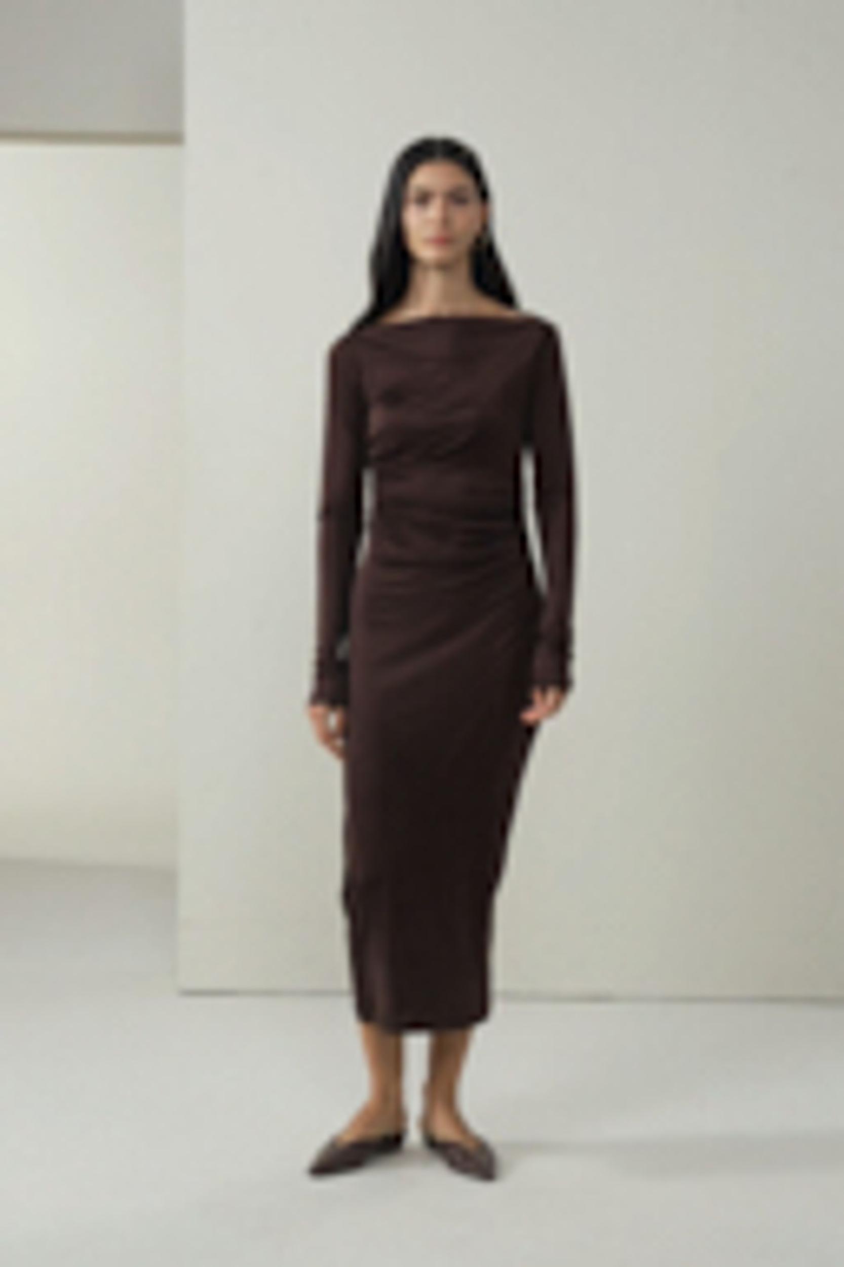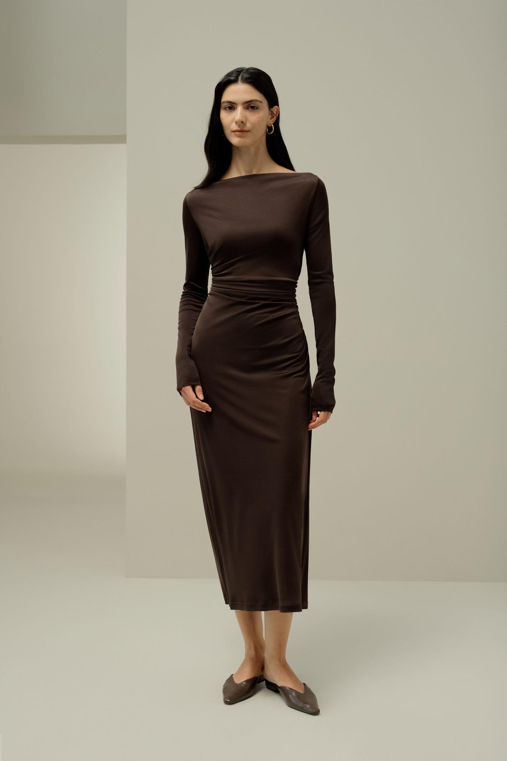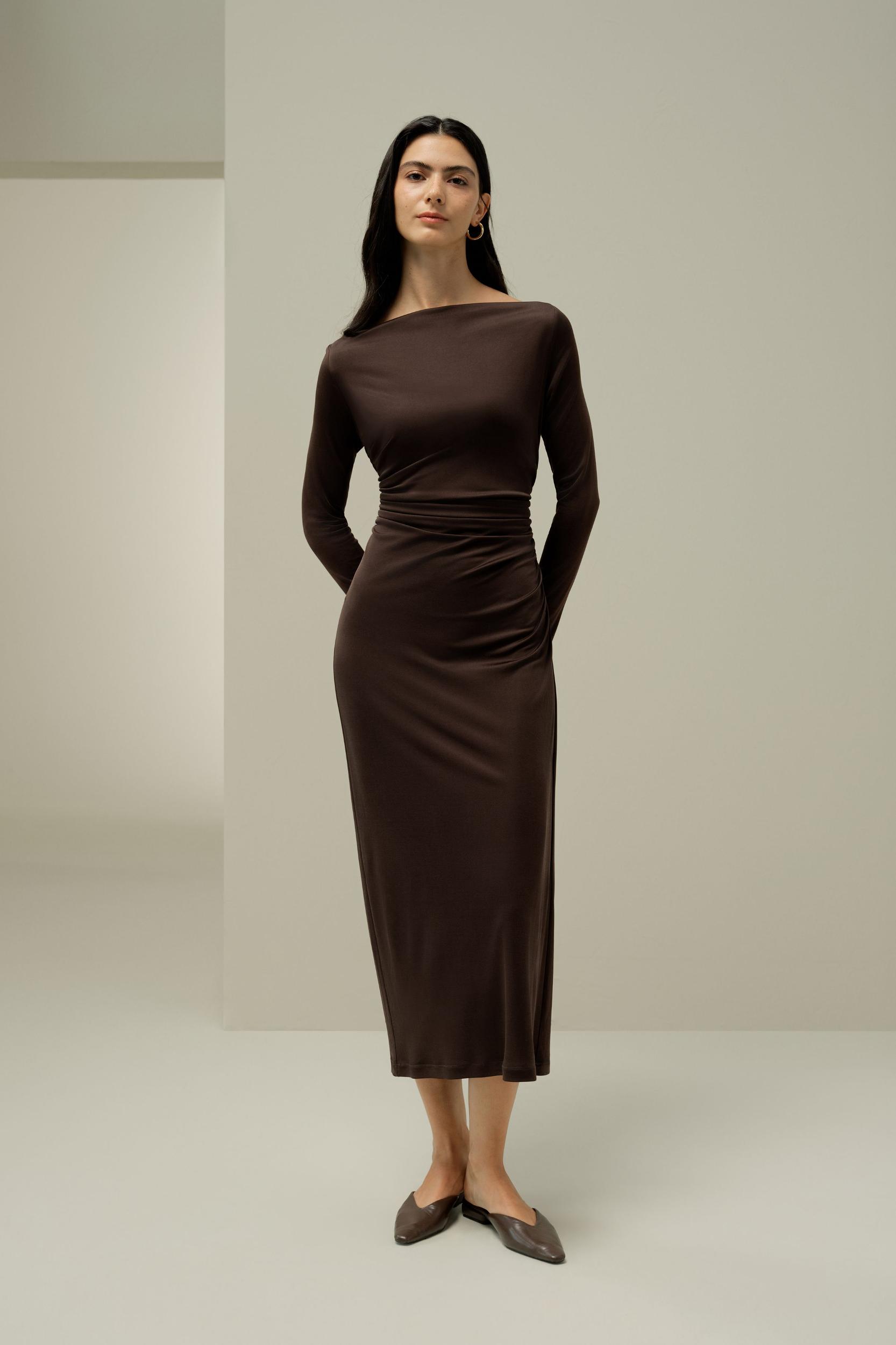 Elevate your wardrobe with this luxurious silk jersey midi dress, featuring an elegant boat neckline, long sleeves, and artful side ruching for a flattering silhouette. Breathable, stretch-enhanced, and irresistibly smooth—this dress is your go-to for timeless sophistication and all-day comfort.