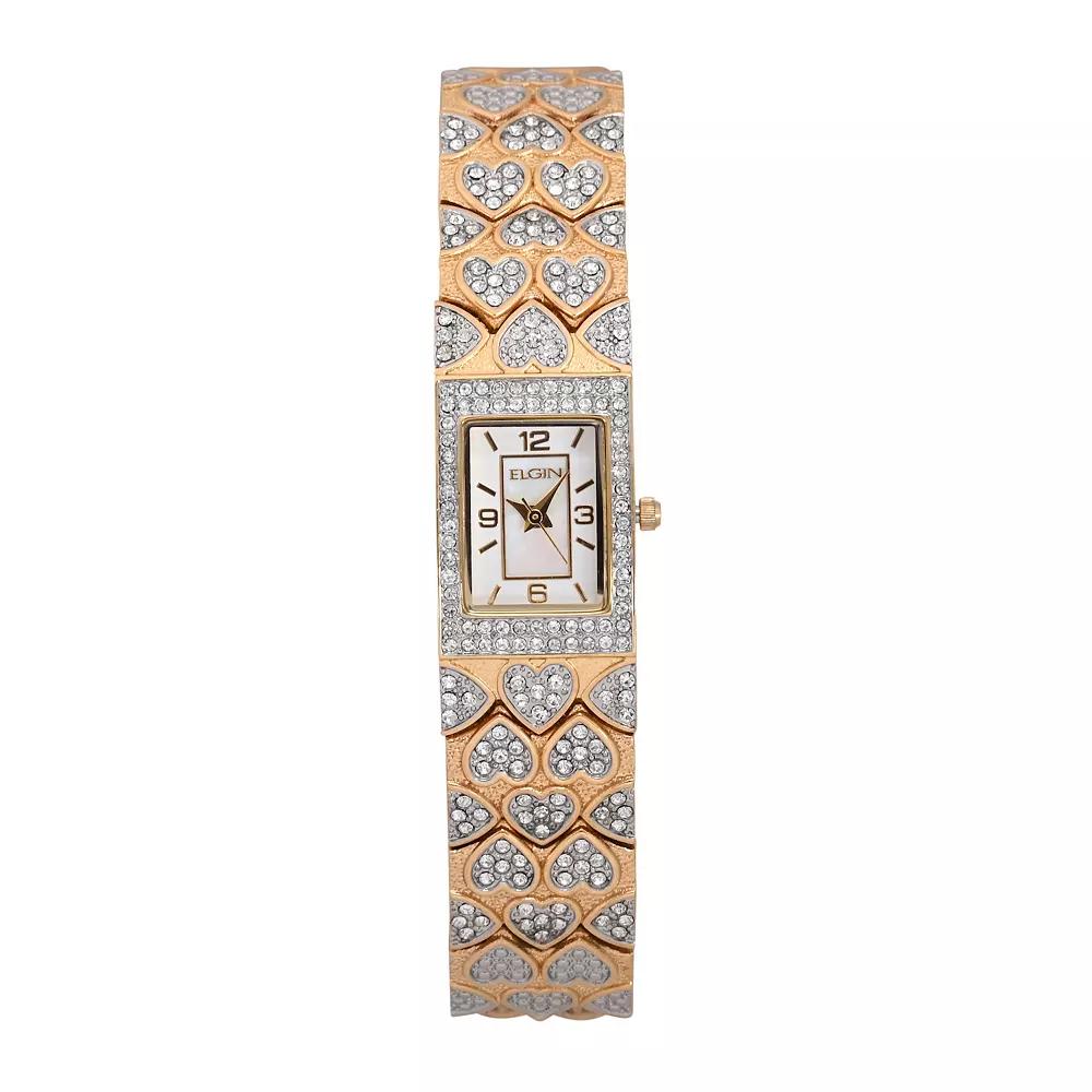 Altogether covered with heart designs accented with cubic zirconia stones, this women's Elgin watch is simply spectacular.DISPLAY Dial color: white mother-of-pearl with cream-colored border Face cover material: mineral crystal CASE Material: gold-tone alloy stainless steel back Size: 25 mm x 17 mm BAND Material: gold-tone alloy Clasp: jewelry Circumference: 215 mm (links removable to 180 mm) Width: 17 mm Not the right fit? Visit your local Kohl's retail store for a free adjustment. DETAILS Movement: quartz Power: battery Water resistance: no rating Packaging: boxed with watch pillow Warranty: manufacturer's 10-year limited For warranty information please click here Model number: EG8012 Size: One Size. Color: Multicolor. Gender: female. Age Group: adult. Material: Metal.