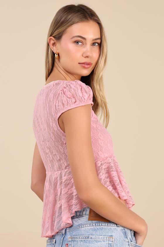 This babydoll-inspired lace top is giving an effortlessly flirty energy, making it the perfect pick for any first date. Cute cap sleeves frame a plunging neckline with white scalloped lace trim and a dainty bow, while a sheer peplum-style hem completes the look.