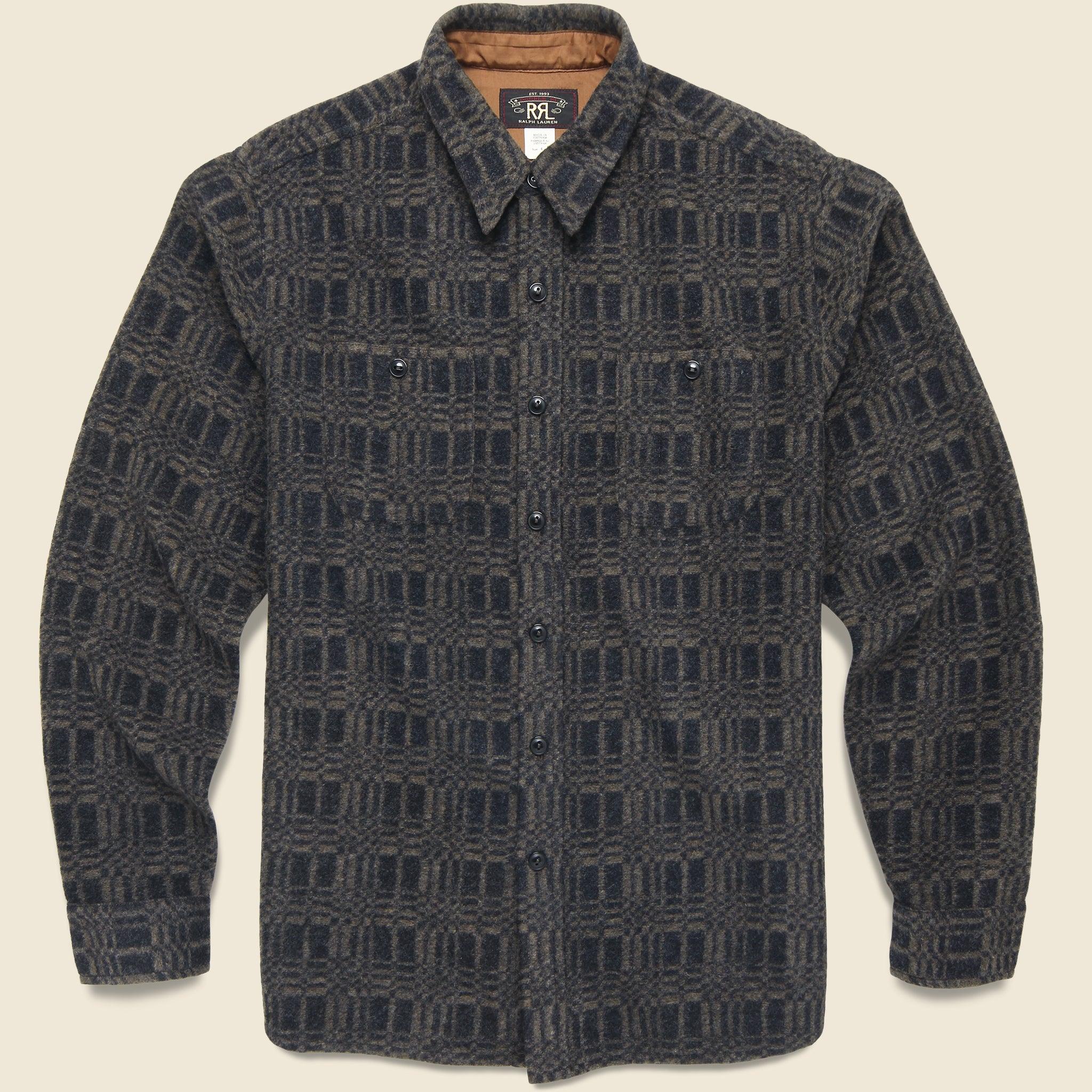 The Elias Workshirt from Double RL is made from a special lightweight wool blend Jacquard that’s knit with a plaid pattern inspired by a vintage blanket. It’s tailored with a relaxed fit that runs true to size and comes detailed with a pair of buttoned chest pockets, a straight collar, and authentic chainstitched construction at the side seams, which is based on workshirts from the 1920s and ‘30s. Soft, lightweight wool blend Jacquard-knit plaid pattern Two buttoned chest pockets Vintage-inspired buttons Slightly curved hem Straight collar Runoff chainstitched side seams Relaxed fit that runs true to size We recommend taking your normal size Materials: 55% wool, 25% polyester, 20% cotton The following measurements are for size Medium: Chest: 43” | Shoulder: 17 ½” | Sleeve: 33 ½” | Length: 29”