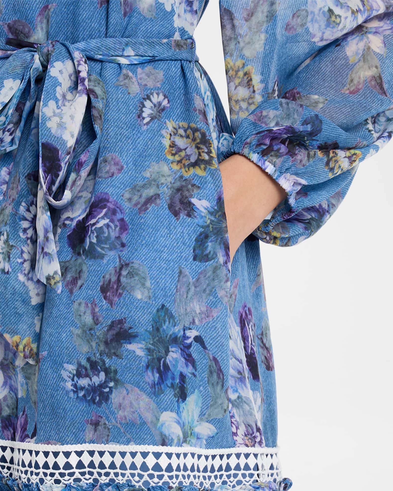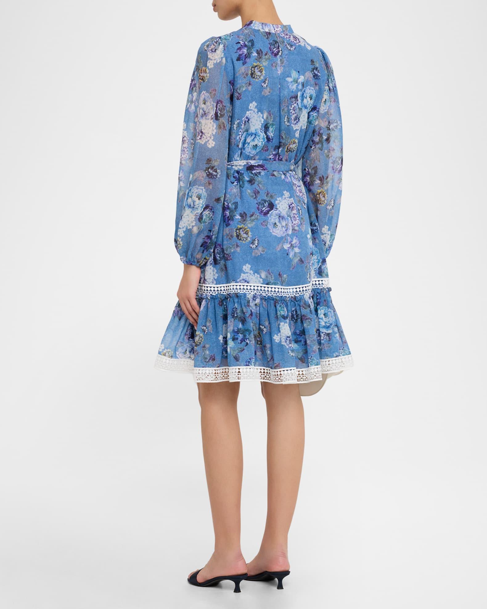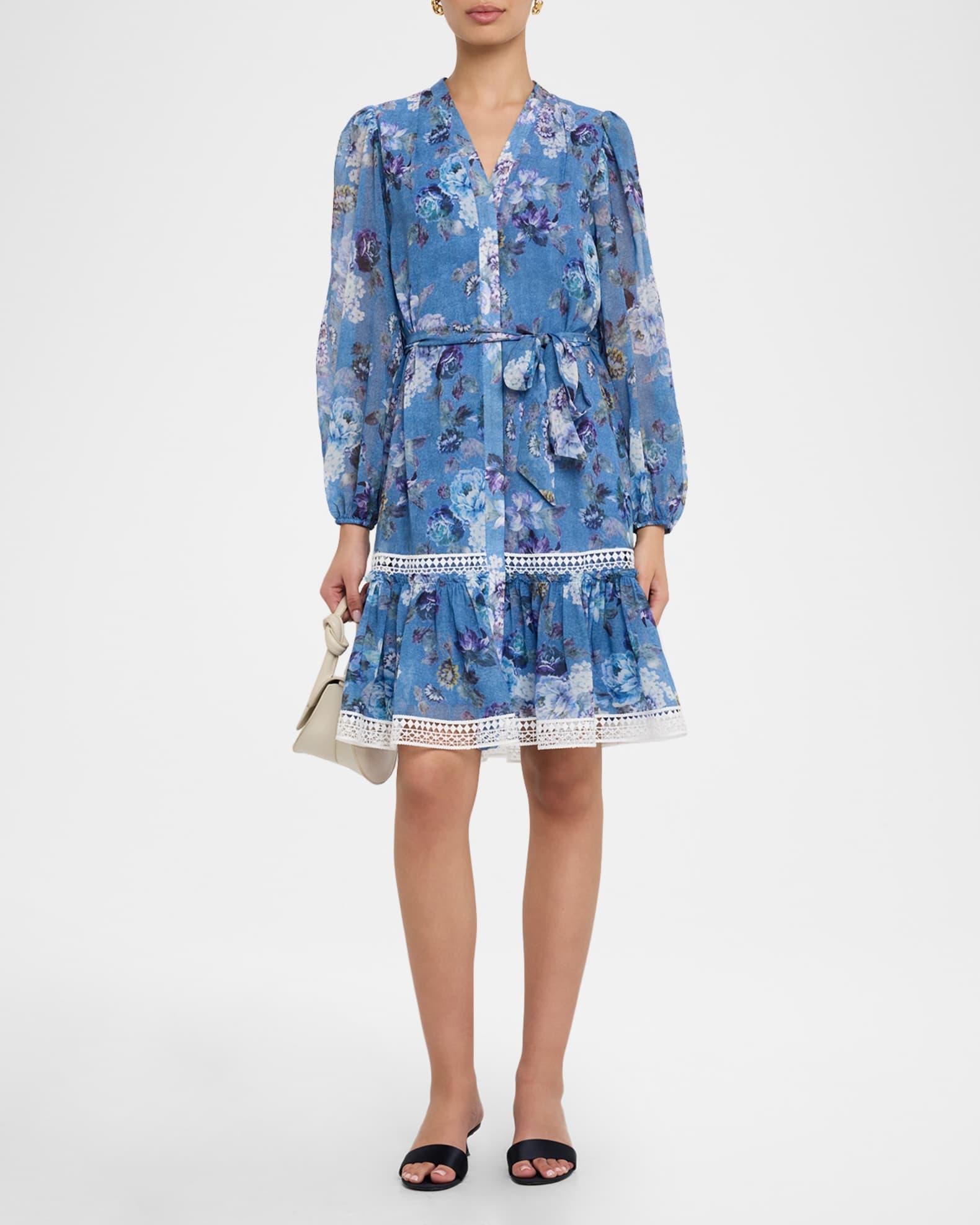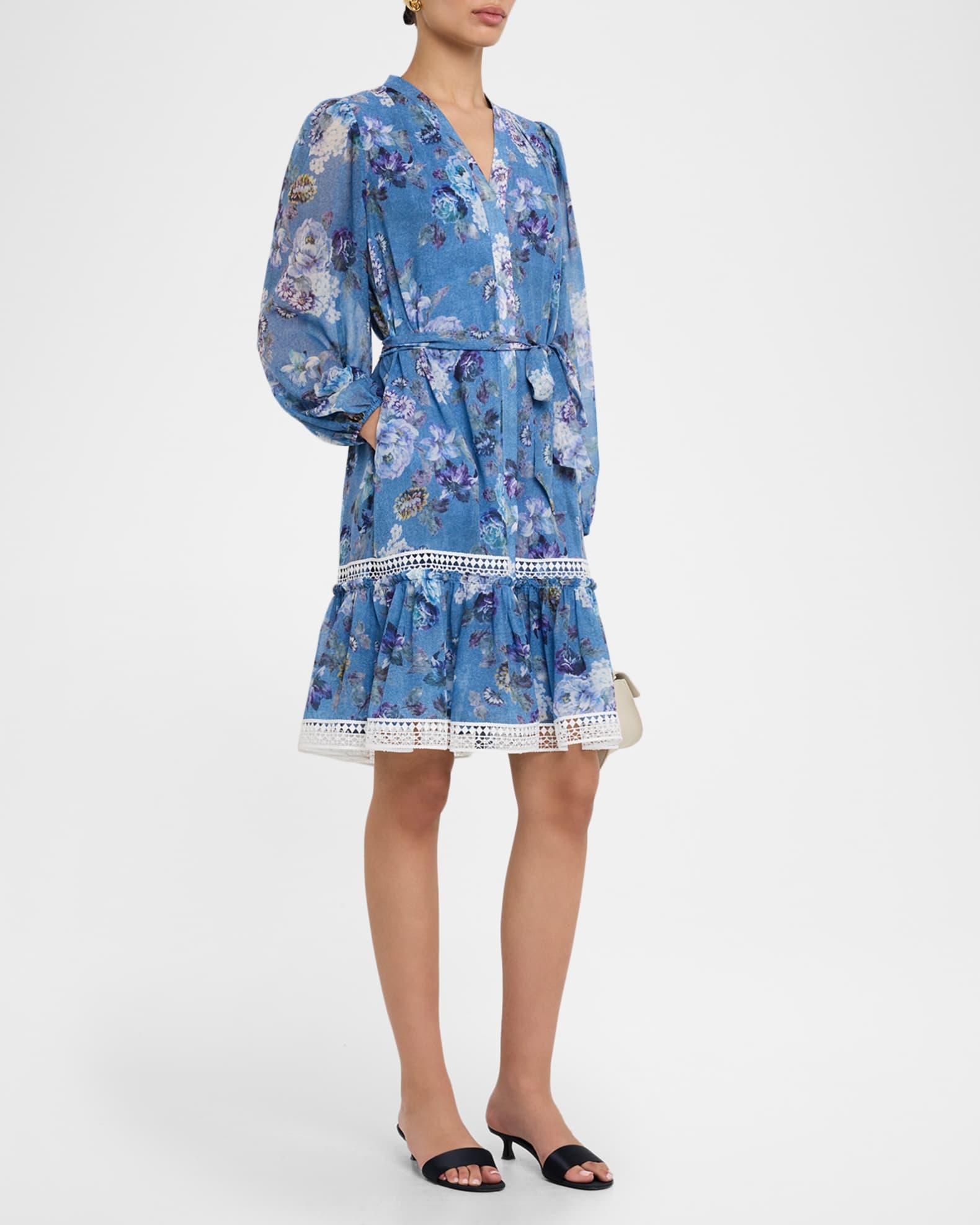 Kobi Halperin "Elisa" dress printed in florals with a denim-effect background and geometric lace trim V neckline Long sleeves with elastic cuffs Self-tie belt Side seam pockets A-line silhouette Hem hits around the knee Concealed button-front Polyester Lining: Polyester Dry clean Imported
