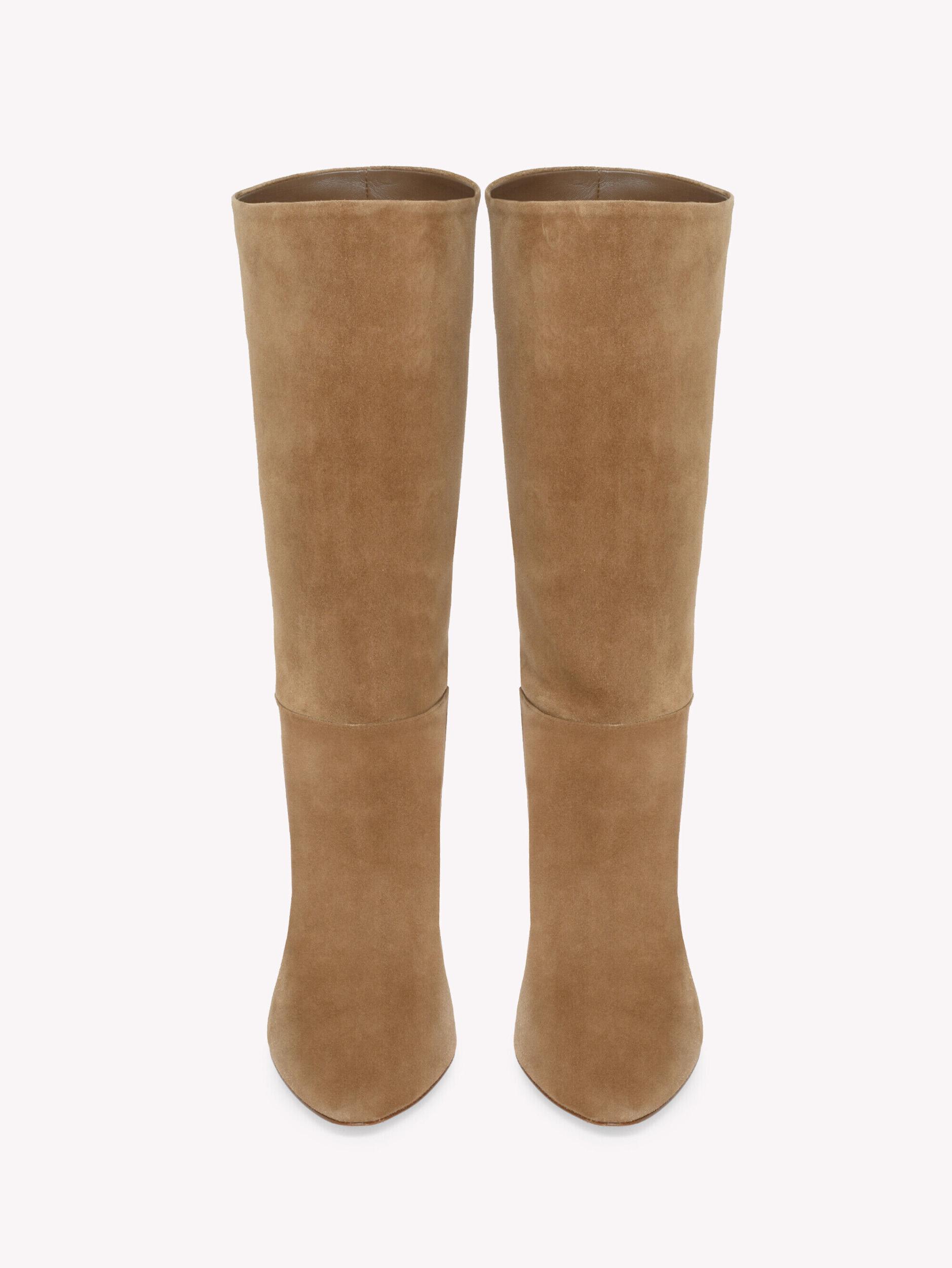 Crafted from supple suede, Elise is pull-on bootie with an almond-shaped toe and an 85mm cone heel. The upper presents a slouchy silhouette. Handmade in Italy.