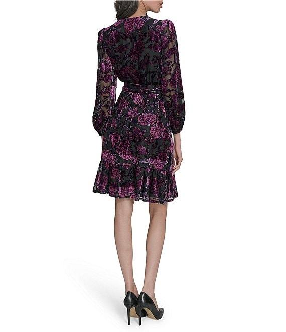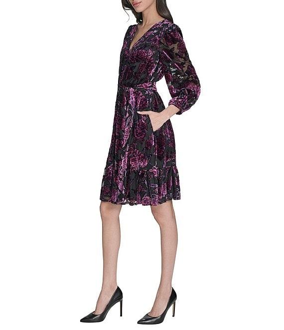 From Eliza J, this dress features: Burnout velvet fabrication A line silhouette V-neckline 3/4 sleeves Self tie sash Zip back closure Approx. 36.5" length Hand wash cold Imported.