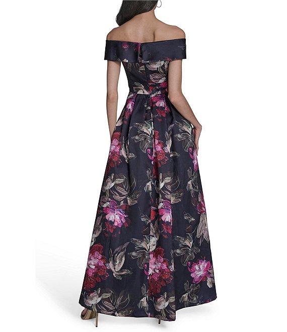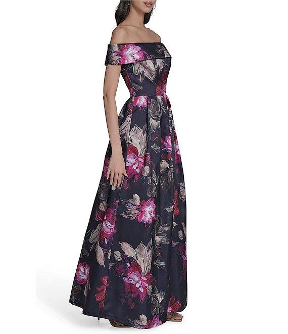 From Eliza J, this dress features: Printed mikado fabrication A line silhouette Off the shoulder neckline Floral print Zip back closure Approx. 61" length Polyester Dry clean Imported.