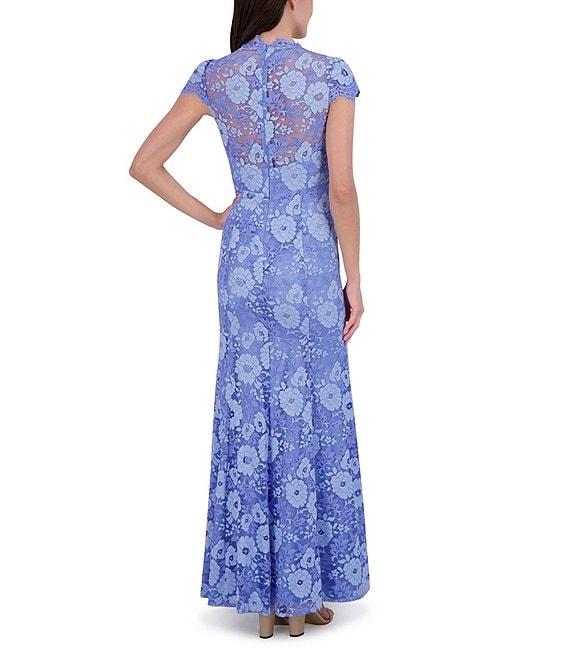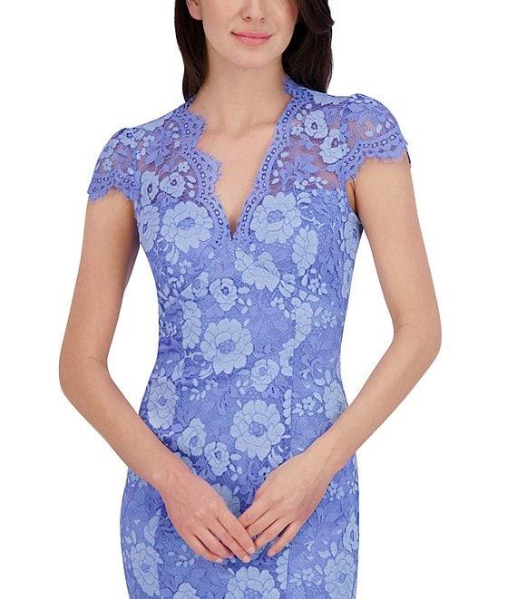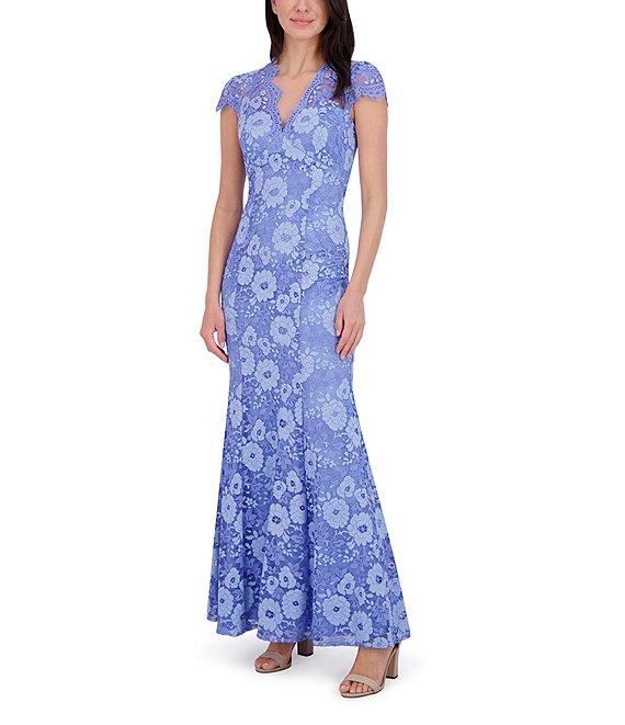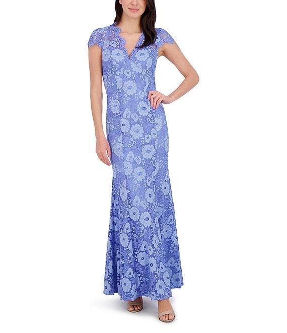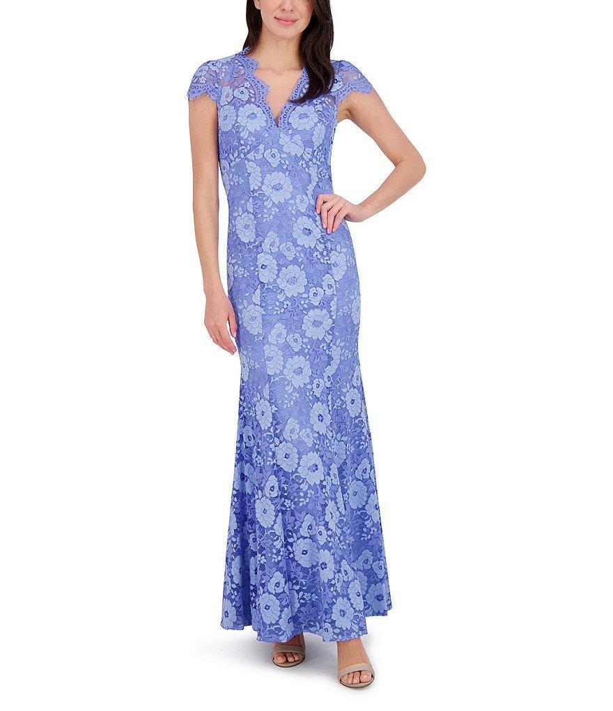 Eliza J Lace V Neck Cap Sleeve Fit and Flare Gown