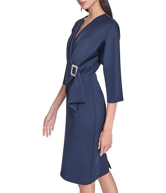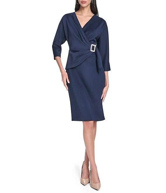 From Eliza J, this dress features: Scuba crepe fabrication Wrap silhouette V-neckline 3/4 sleeves Jeweled belt buckle Knee length Zip back closure Approx. 42.5" length Polyester/Spandex Hand wash cold Imported.