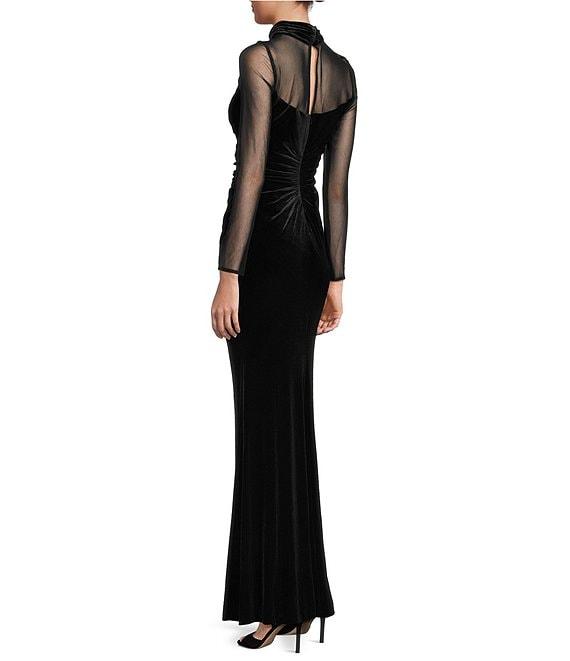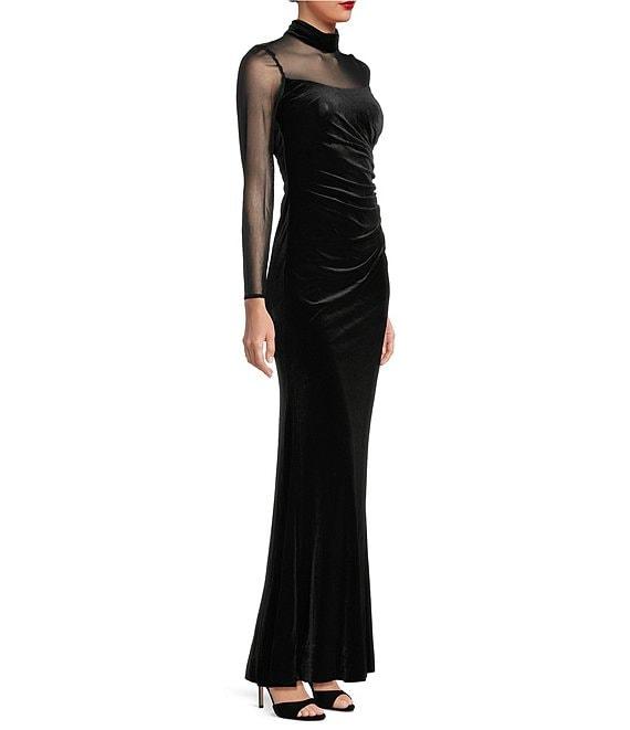From Eliza J, this gown features: mesh stretch velvet fabrication illusion mock neckline long illusion sleeves side waist ruched detail keyhole back detail fully lined center zip back closure approx. 61" length from shoulder to hem polyester/spandex dry clean only Imported.