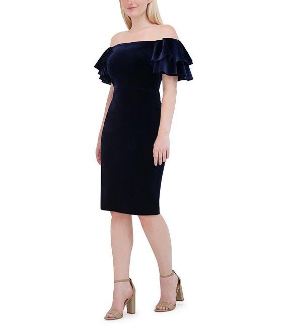 From Eliza J, this dress features: Sheath silhouette Velvet fabrication Off the shoulder neckline Short ruffle sleeves Zip back closure Partially lined Approx. 42" length Polyester/spandex Dry clean Imported.