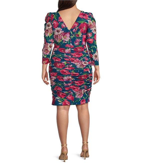 From Eliza J Plus, this dress features: Mesh fabrication Sheath dress silhouette Boat neckline 3/4 sleeves Draped sleeves Lined Floral print Chandelier skirt Center back zipper closure Approx. 43" length Polyester/spandex Hand wash Imported.