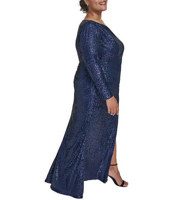 Eliza J Plus Size Sequin Long Sleeve Asymmetrical Neck Side Tuck Gown