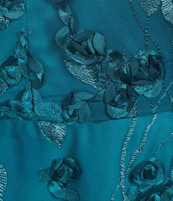 From Eliza J, this dress features: Embroidered mesh fabrication V-neckline Sleeveless Fit and flare silhouette 3D floral details Zip back closure Approx. 47" in length from high point shoulder Polyester Dry clean Imported.