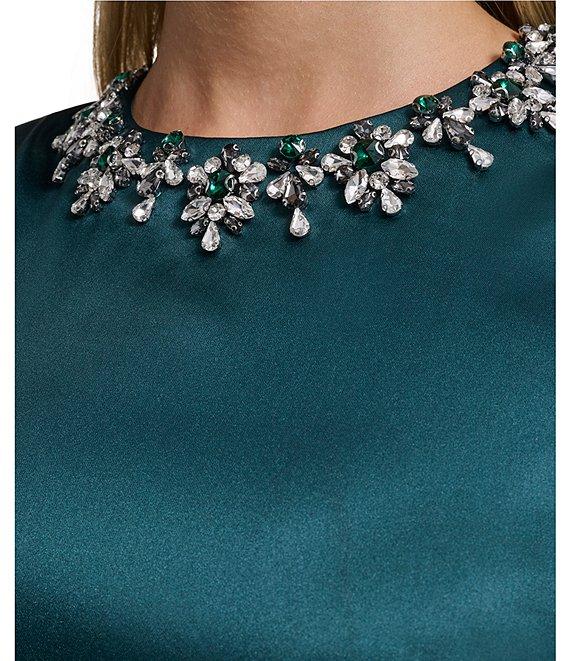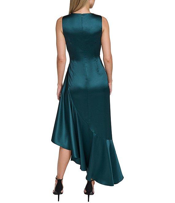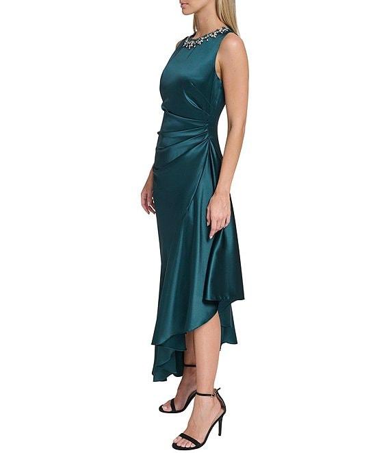 From Eliza J, this dress features: Satin fabrication Sheath silhouette Crew neckline Sleeveless Jeweled neckline Asymmetrical ruffle hem Zip back closure Approx. 42" length Polyester/Spandex Hand wash cold Imported.