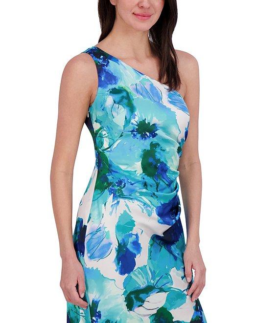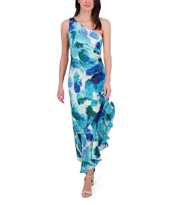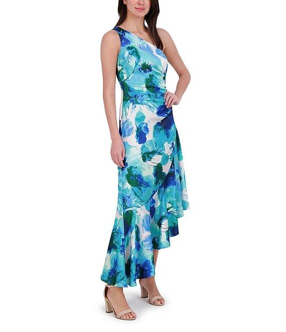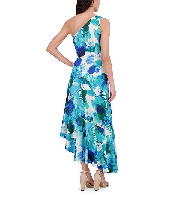 Eliza J Satin Floral Print One-Shoulder Neck Sleeveless Ruffle Asymmetrical Hem Midi Dress