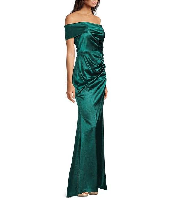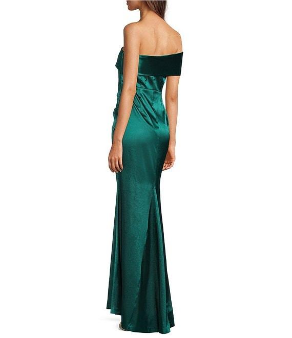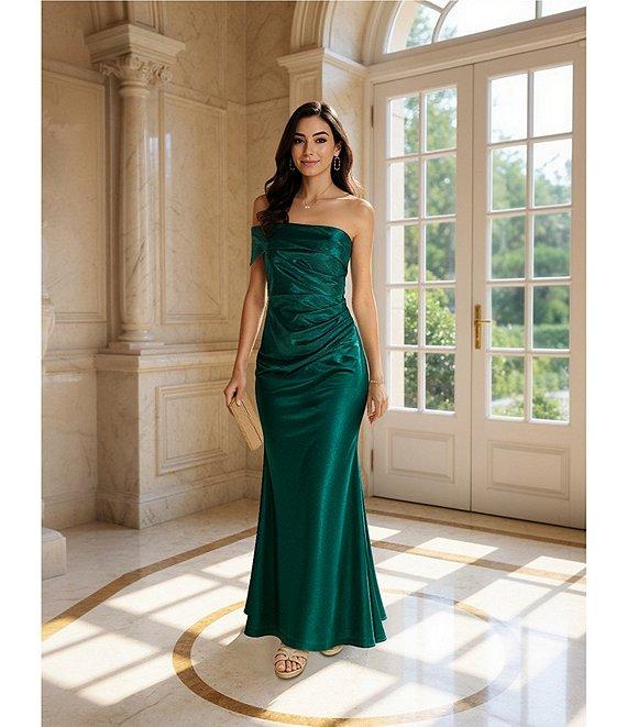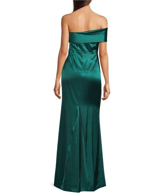 From Eliza J, this dress features: Satin fabrication Off-the-shoulder neckline One shoulder Pleated front detail Side slit detail Side zip closure Approx. 61" length Polyester Dry clean Imported.