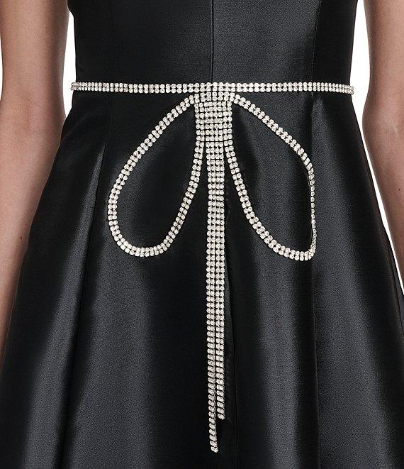 From Eliza J, this dress features: Taffeta fabrication A line silhouette Sweetheart neckline Sleeveless Rhinestone trim Zip back closure Approx. 51" length Polyester Dry clean Imported.