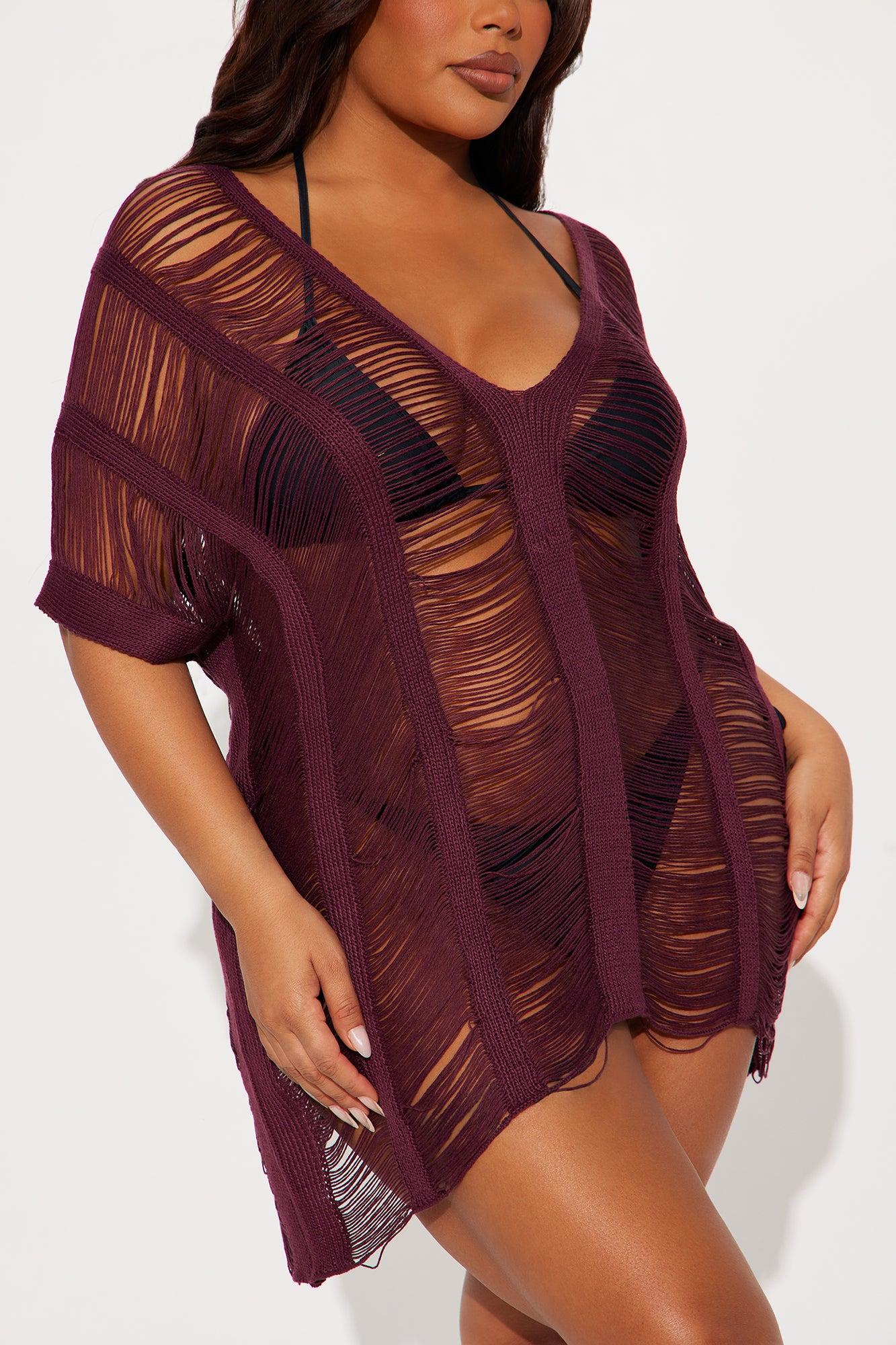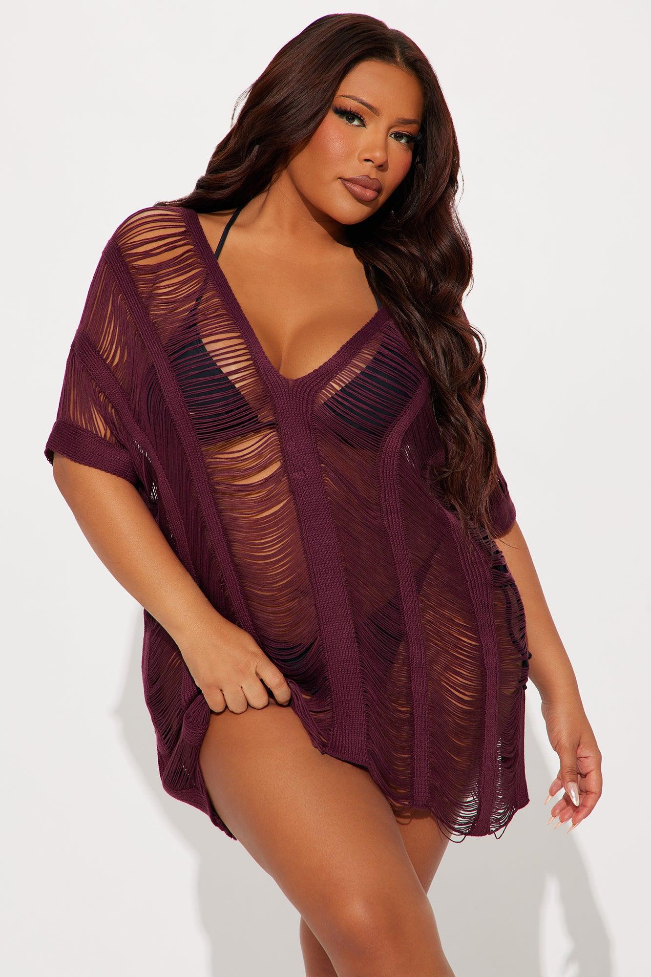 Available In Purple. Cover Up Dress Sheer Crochet Mini Length V-Neck Full Stretch Final Sale 100% Acrylic Imported