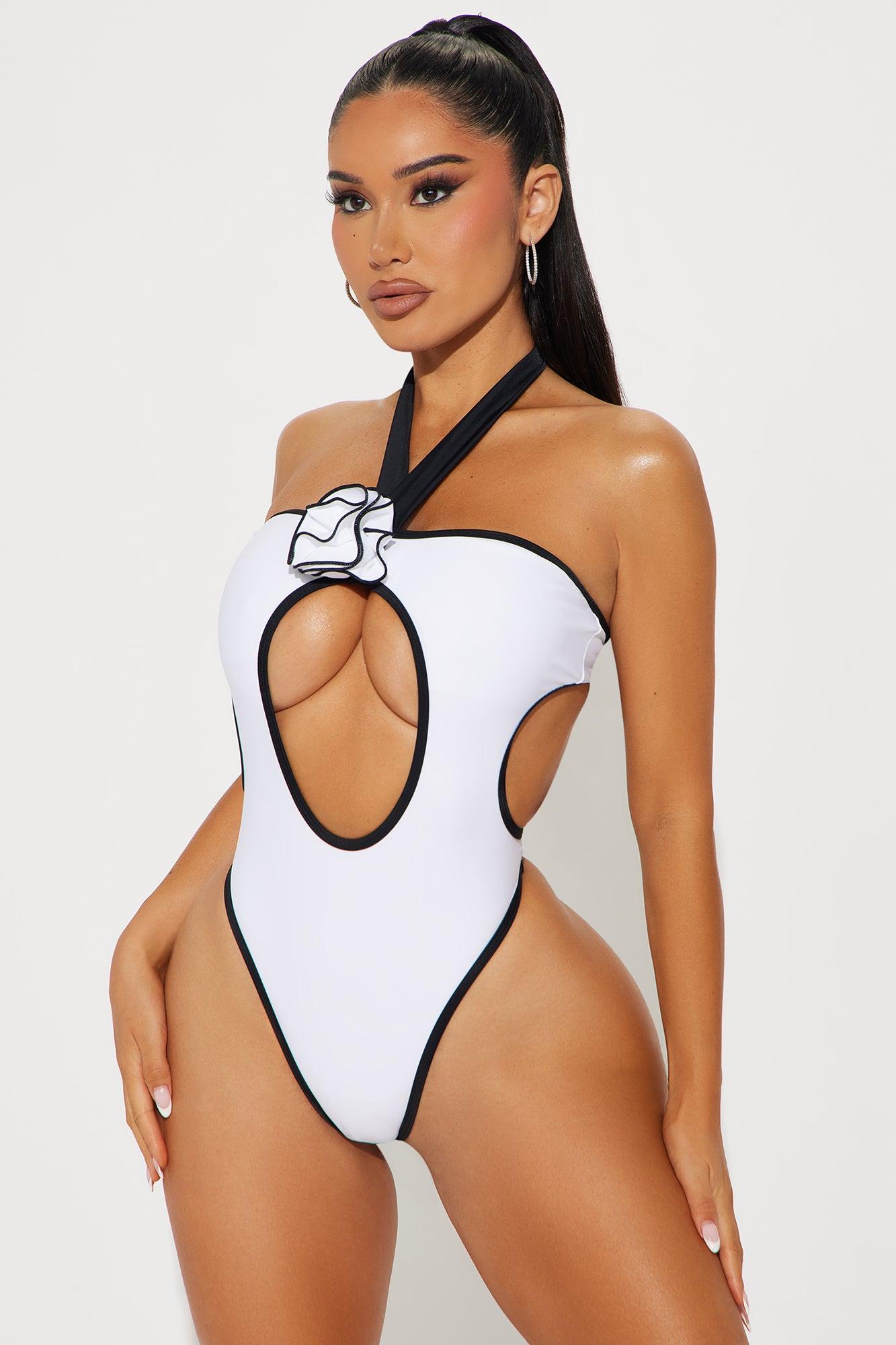 Available In White/Black. 1 Piece Swimsuit Bandeau Bikini Top Removable Cups Halter Neck Ties 3D Rose Applique Cut Out High Leg Cut Cheeky Contrast Trim Full Stretch Final Sale Shell: 80% Nylon 20% Spandex Lining: 92% Polyester 8% Spandex Imported