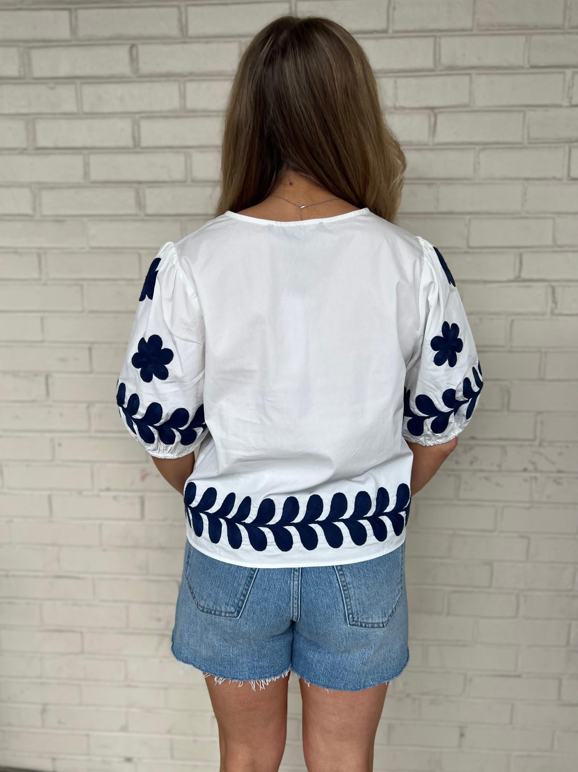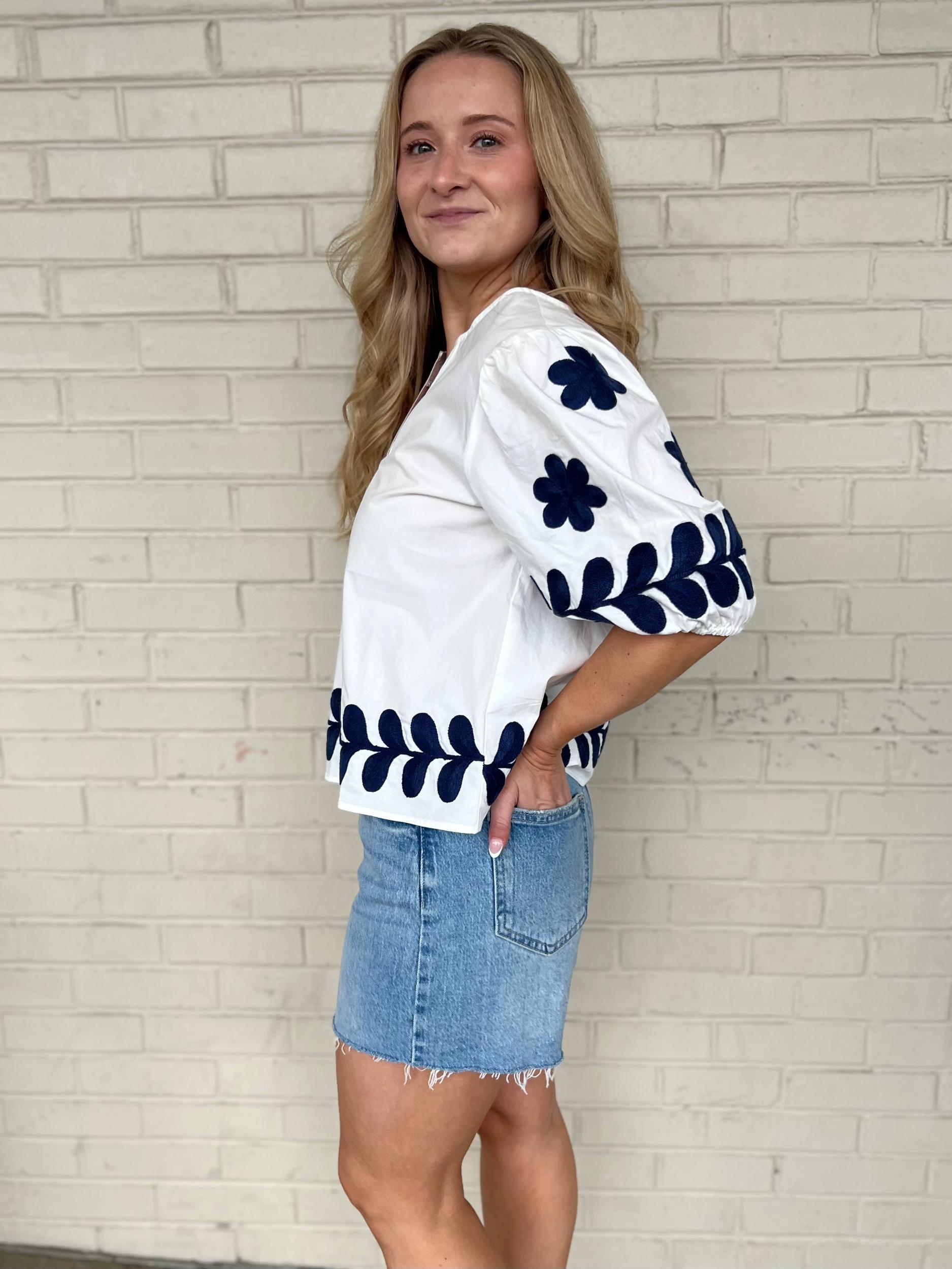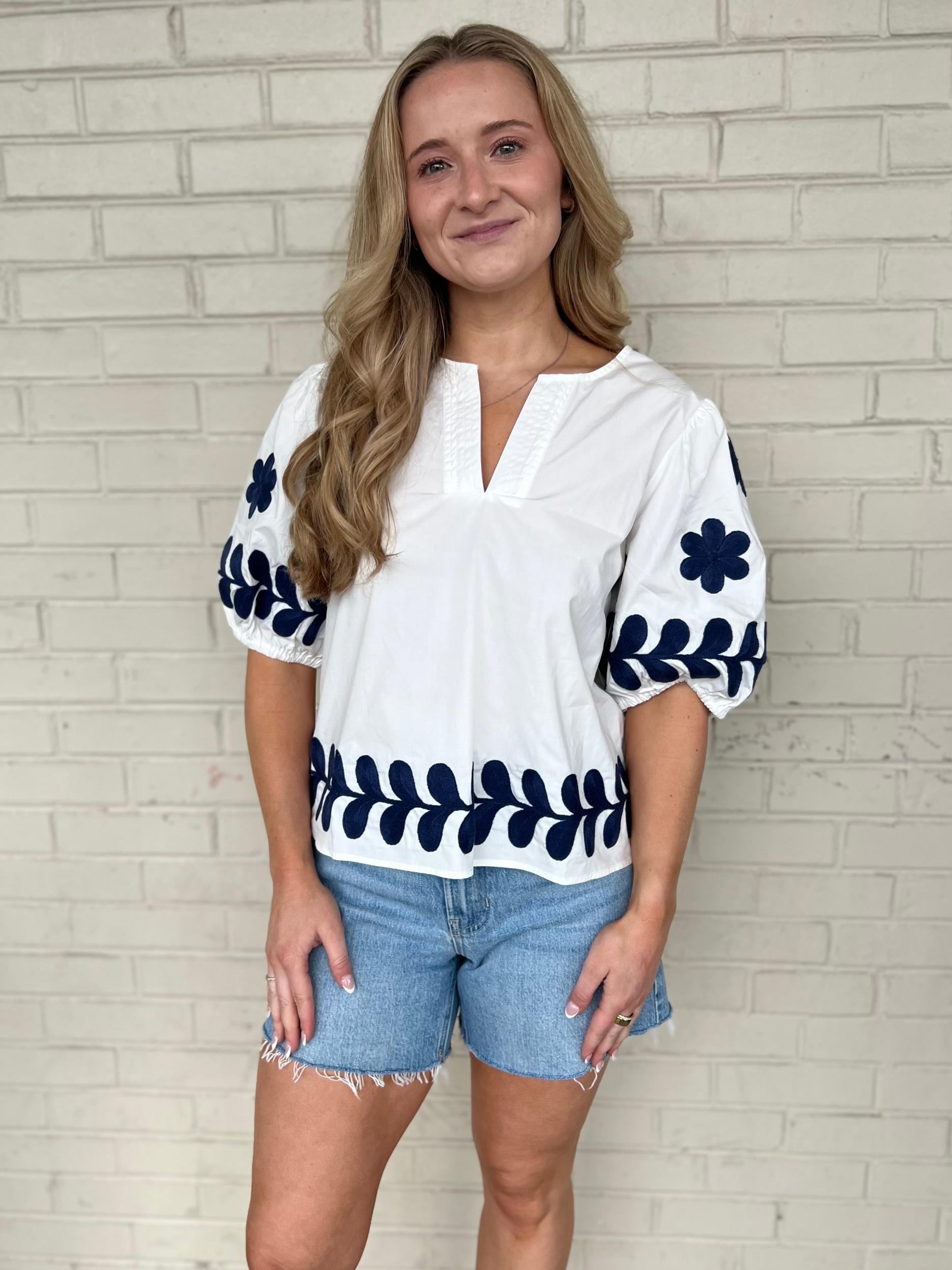 Elevate your wardrobe with our Elizabeth Top, a dreamy white blouse that brings whimsy to everyday style! This puff-sleeved beauty features delicate embroidery details on the sleeves and bottom hem. The split neckline adds just the right touch of casual elegance, perfect for sunny brunches or evening strolls. Pair with your favorite jeans for an instant outfit that says "effortlessly fabulous!"