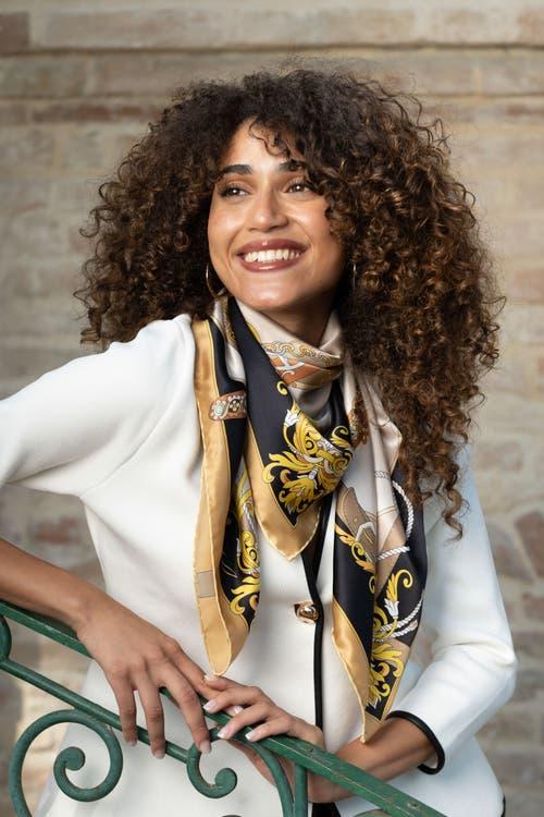 Printed on luxurious silk satin, this scarf features a charming design of pocket watches and jeweled belts, symbolizing the delicate balance of time and style. The intricate details and rich colors make this foulard a standout accessory, perfect for adding a touch of sophistication and playful charm to your wardrobe.