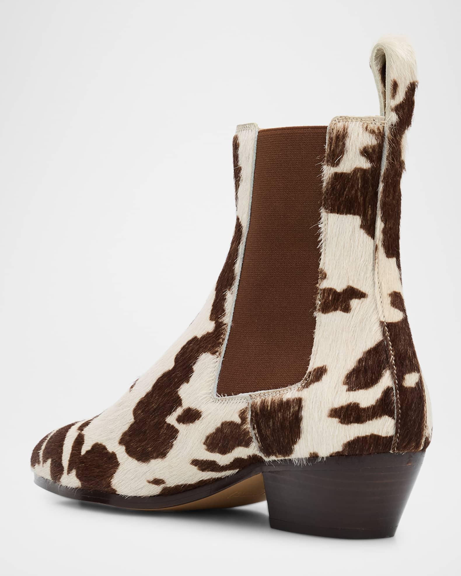 Odissi "Ella" Chelsea booties in cow print dyed calf pony hair (China) revisit a classic Chelsea bootie with a relaxed downtown attitude and a Western flair 1.38 in / 35 mm stacked block heel Elongated almond toe Lining: Leather Padded insole Gored sides Elongated pull tab backstay Slip-on style Rubber outsole Spot clean Trim: Leather Imported