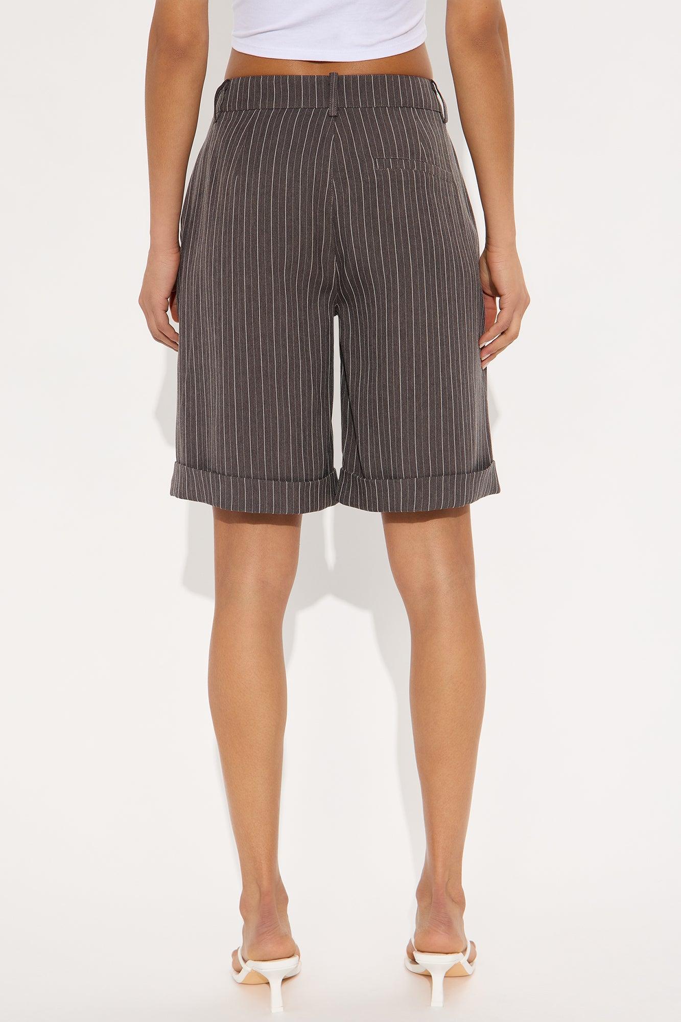 Available In Charcoal. Bermuda Trouser Short Mid Rise Button & Zip Closure Hand & Back Pockets Cuffed Hem Pinstripe Non Stretch 95% Polyester 4% Rayon 1% spandex Imported California Proposition 65 WARNING: Cancer and Reproductive Harm - www.P65Warnings.ca.gov.