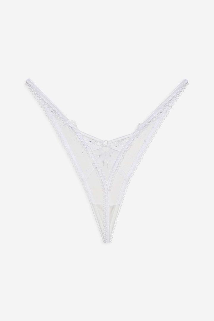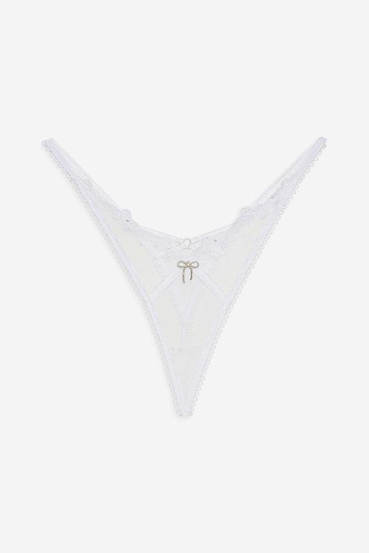 The Ellery white thong is the perfect winter lingerie. Designed with beautiful bow embroidery, this thong lingerie spotlights a dangling rhinestone-encrusted bow, a pearl ring detail at the center-front, and a charming picot elastic trim. Pair it with the Ellery Underwire Bra for an ethereal winter look.