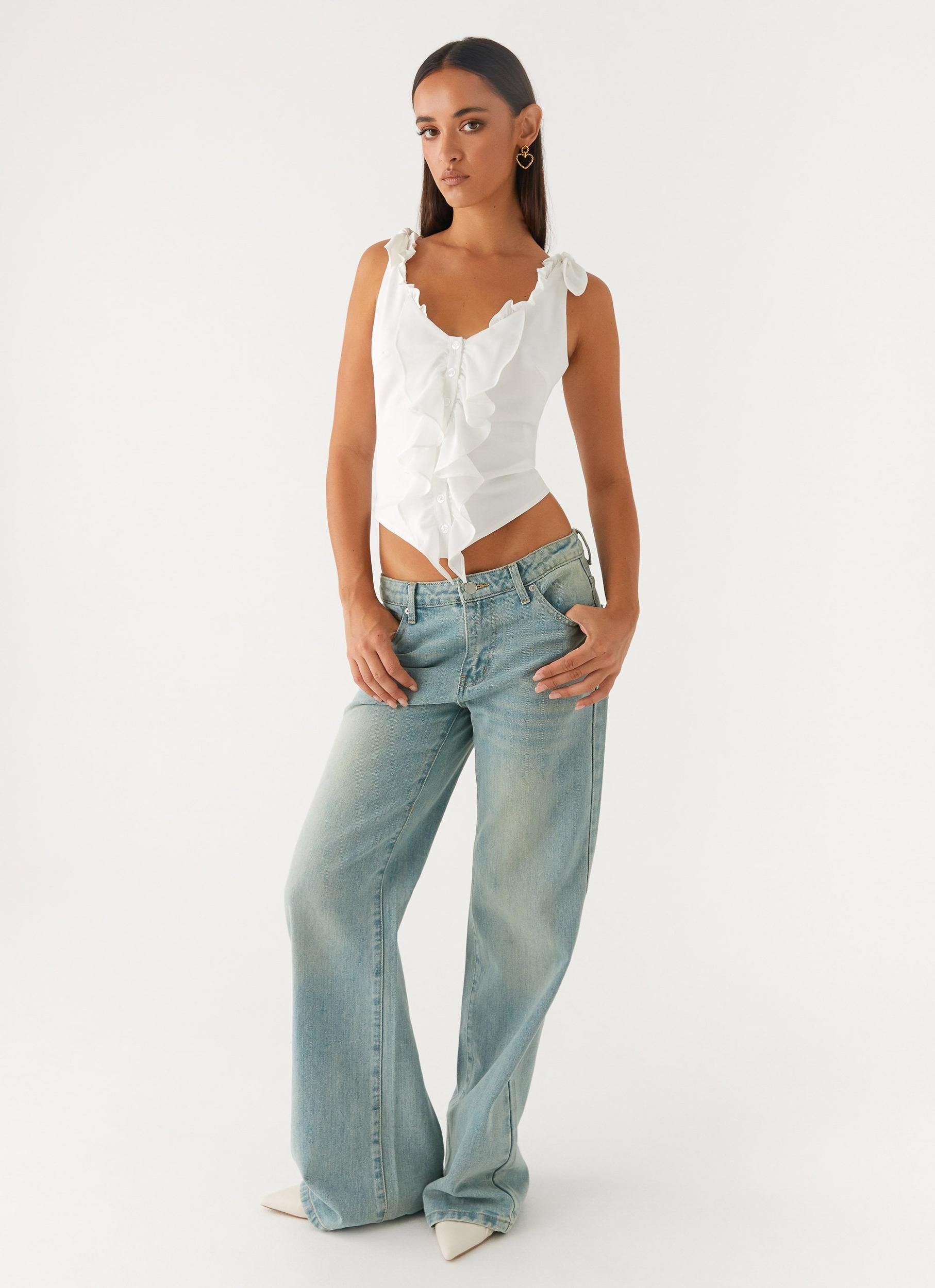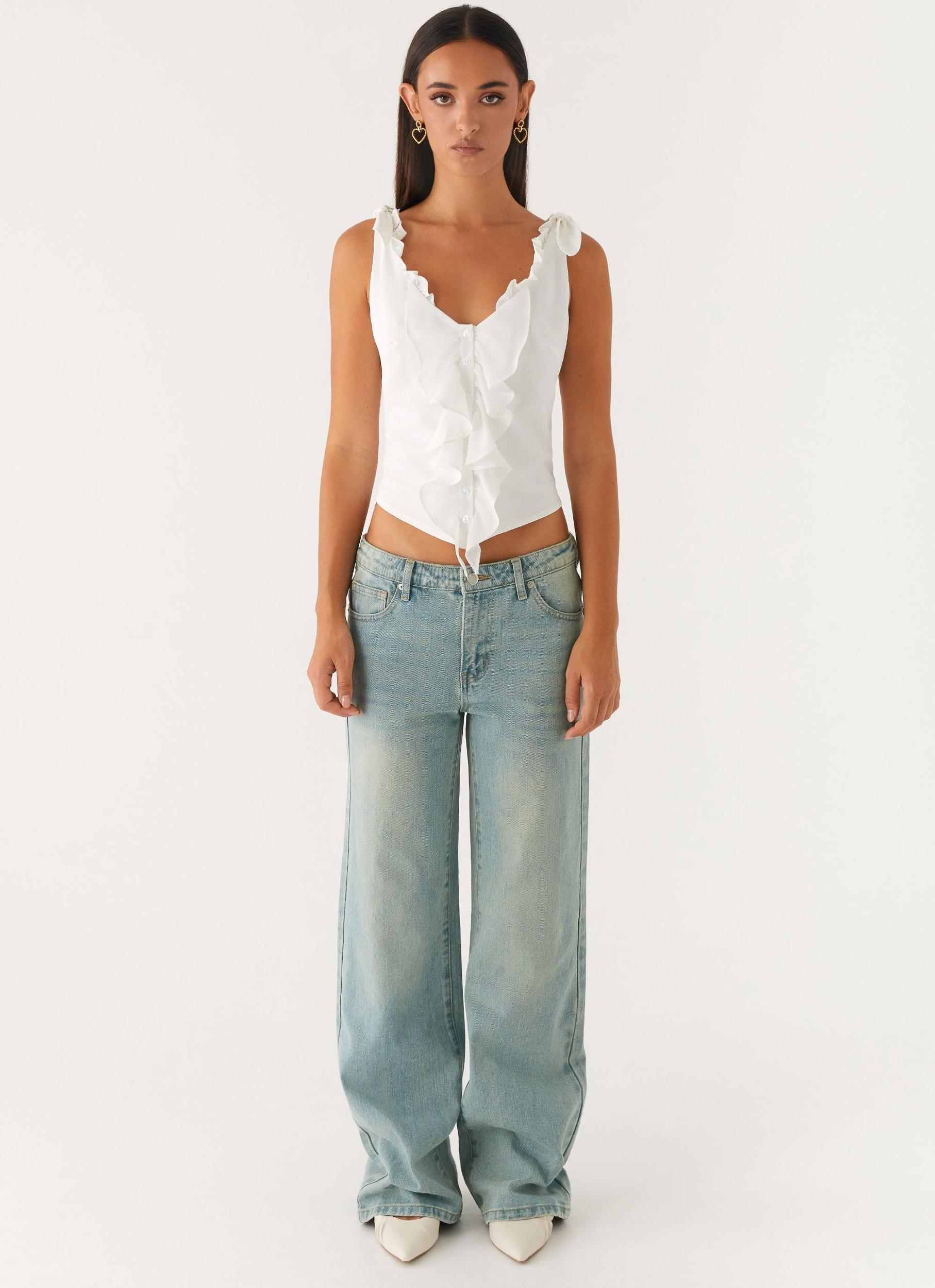Peppermayo Exclusive The Ellery Top is sleek and simple. Featuring a rounded neckline, fully lined design, and twin tie straps, it’s made for golden skies and nights that call for effortless elegance and style. - Rounded neckline- Frilled neckline- Front bow and frill detailings- Front buttons- Fully lined- Elasticated back- Twin tie straps- 100% polyester Size AU 8 / US 4 garment measurements: Bust: 85 cm / 33.5 in.Hem: 72 cm / 28.3 in.Length: 54 cm / 21.3 in. Roberta is 177cm and wears size AU 6 / size US 2