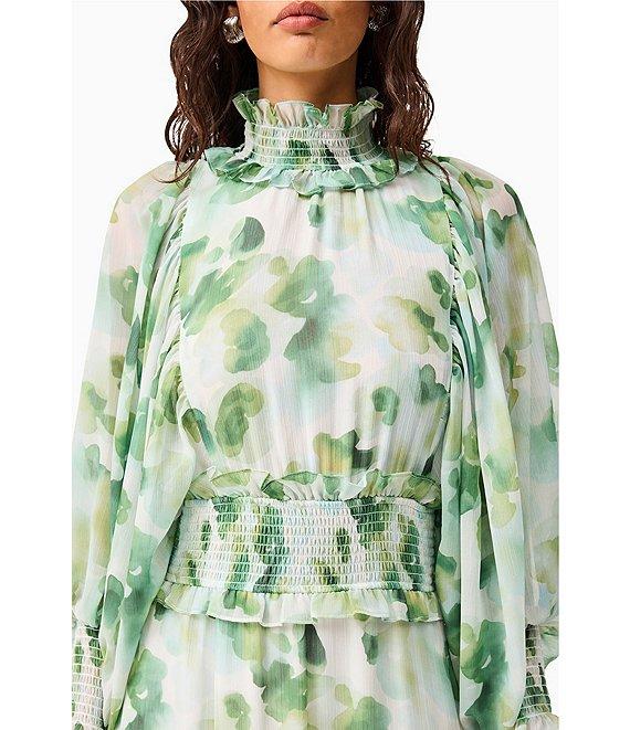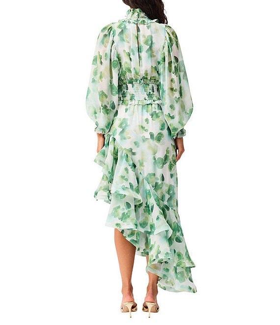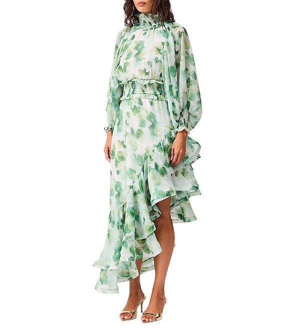From ELLIATT, this dress features: Georgette fabrication Floral print Smocked high neckline Long balloon sleeve with elastic cuffs Smocked waistband Ruffle detail Asymmetrical ruffle hem Back keyhole button closure Approx. 60" length Polyester Dry clean Imported.
