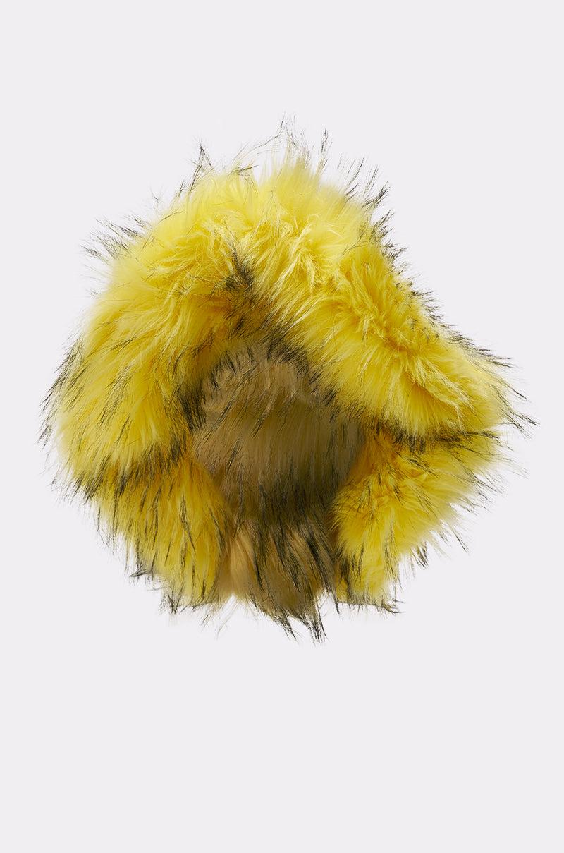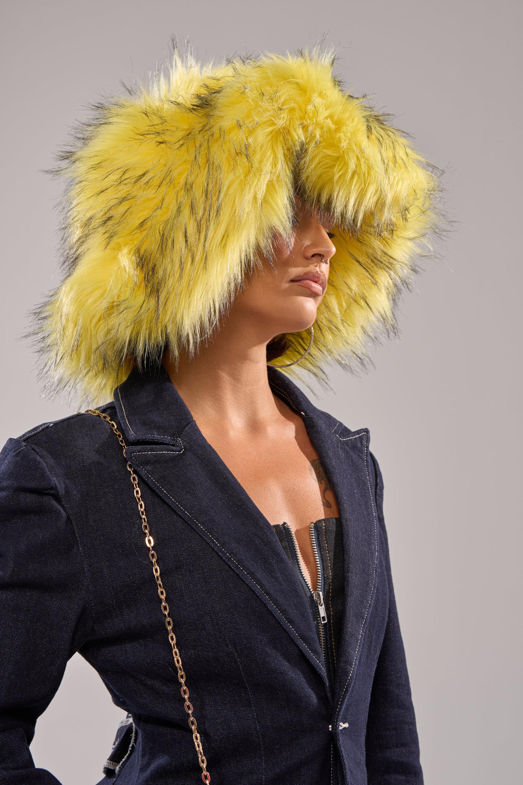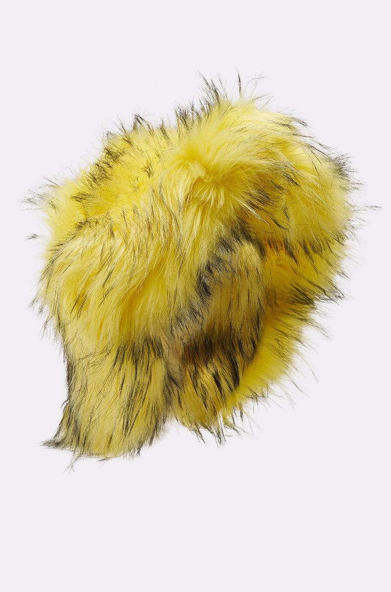 The AKIRA Label Ellie Faux Fur Bucket Hat is crafted from an ultra-shaggy, yellow faux fur with subtle black detailing. It features a classic floppy bucket hat silhouette with a flat crown, a downturned brim, and an inner lining. - 100% Polyester- Imported (all measurements approximate from size O/S)- 28” Head Circumference- 8” Head DiameterProduct ID: 1071725