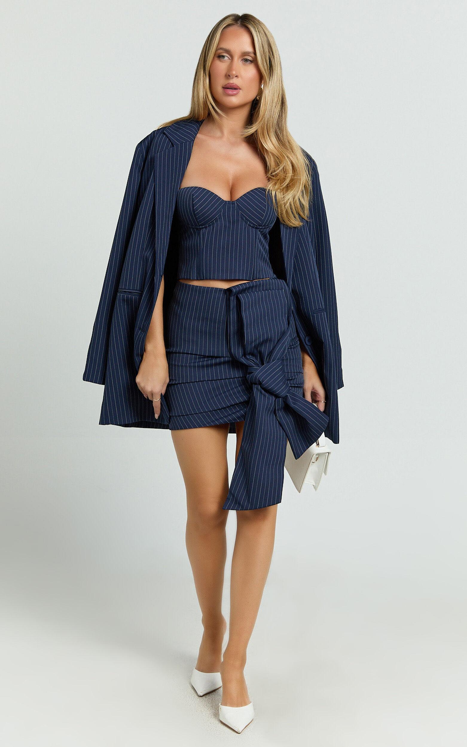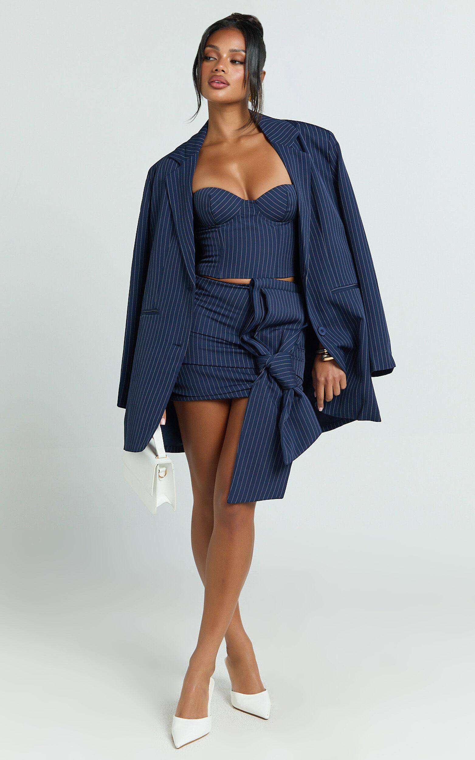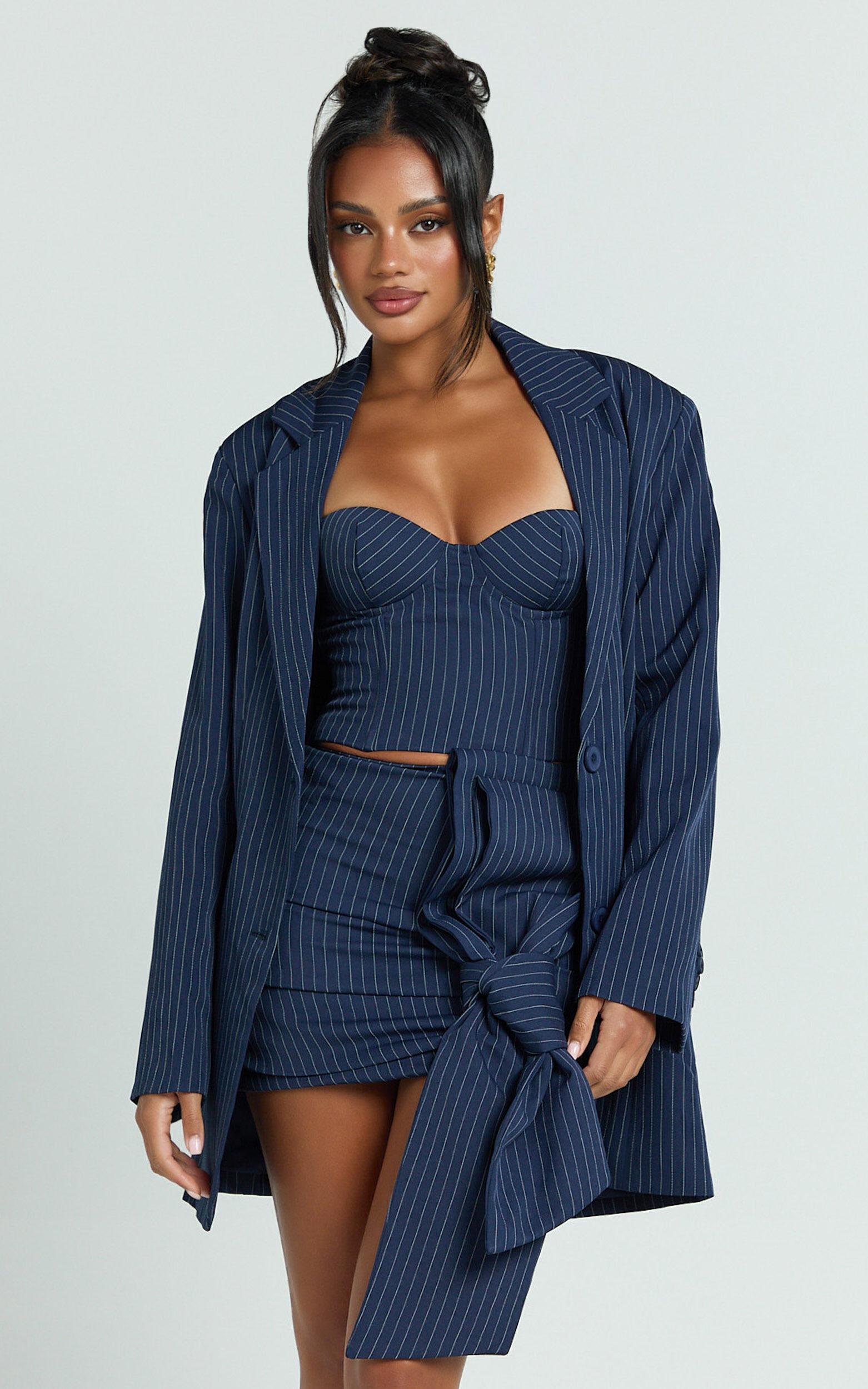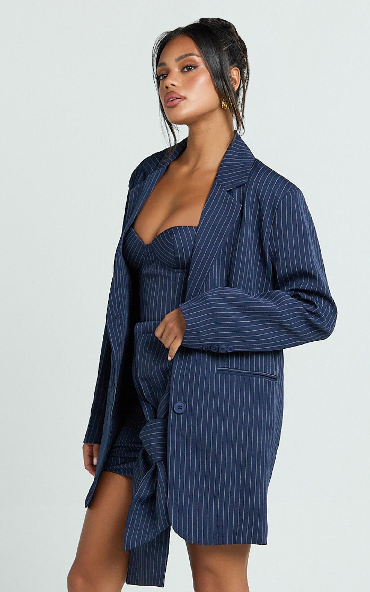 Make a statement in the Elliot Jacket - a pinstripe, single-breasted relaxed shoulder blazer in a chic navy that is as versatile as it is stylish. This trendy mid-weight woven polyester piece seamlessly transitions from your daytime hustle to evening party vibes, making it the ultimate jacket for both Gen Z and Millennials looking to elevate their wardrobe game.Product Details:PocketsInner LiningButtonsMid Weight WovenStandard LengthLong SleevePolyesterSize and FitSize S / 8 length: 84cm / 33.07inMaterial and CareMain Fabric: 94% Polyester, 6% Spandex Lining: 90% Polyester, 10% SpandexLow Stretch