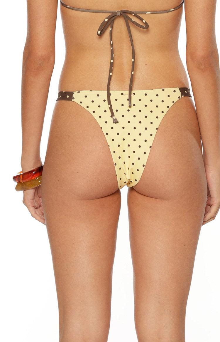 Yellow Polka Dot Cheeky Bikini Bottoms How to style:Embrace endless summer vibes in our Ellis Yellow Polka Dot Stretch Bikini Bottoms, the ultimate choice for your next beach getaway. Featuring a vibrant stripe print and eye-catching contrast sides, these bikini bottoms are designed with functional channel detailing so you can easily customise your coverage.Pair them with the matching bikini top and a sheer sarong for a chic, coordinated look! Features: Contrast polka dot print Mid rise Cheeky fit Pull on style Fully lined Stretch fabrication Perfect for vacations, pool parties, and summer adventures!