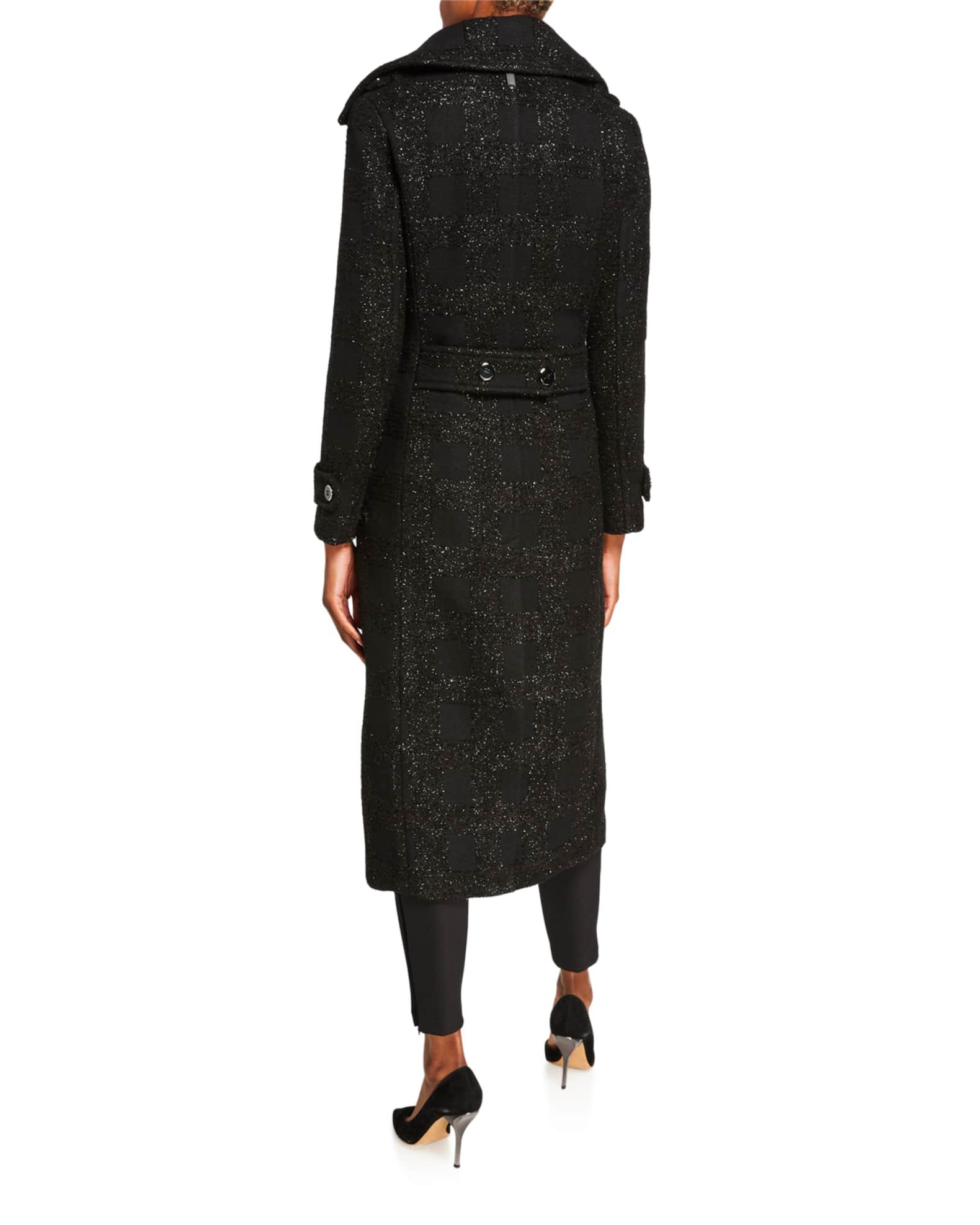 Mackage "Elodie" double-breasted sparkly long coat. Approx. 47"L from shoulder to hem. Overlapping shirt collar. Long sleeves; button tabs at shoulders and cuffs. Double-breasted button front. Belted detail at back. Leather welt pockets. A-line silhouette. Midi-length hem. Wool/polyester/acrylic. Polyester/spandex lining. Dry clean. Imported.