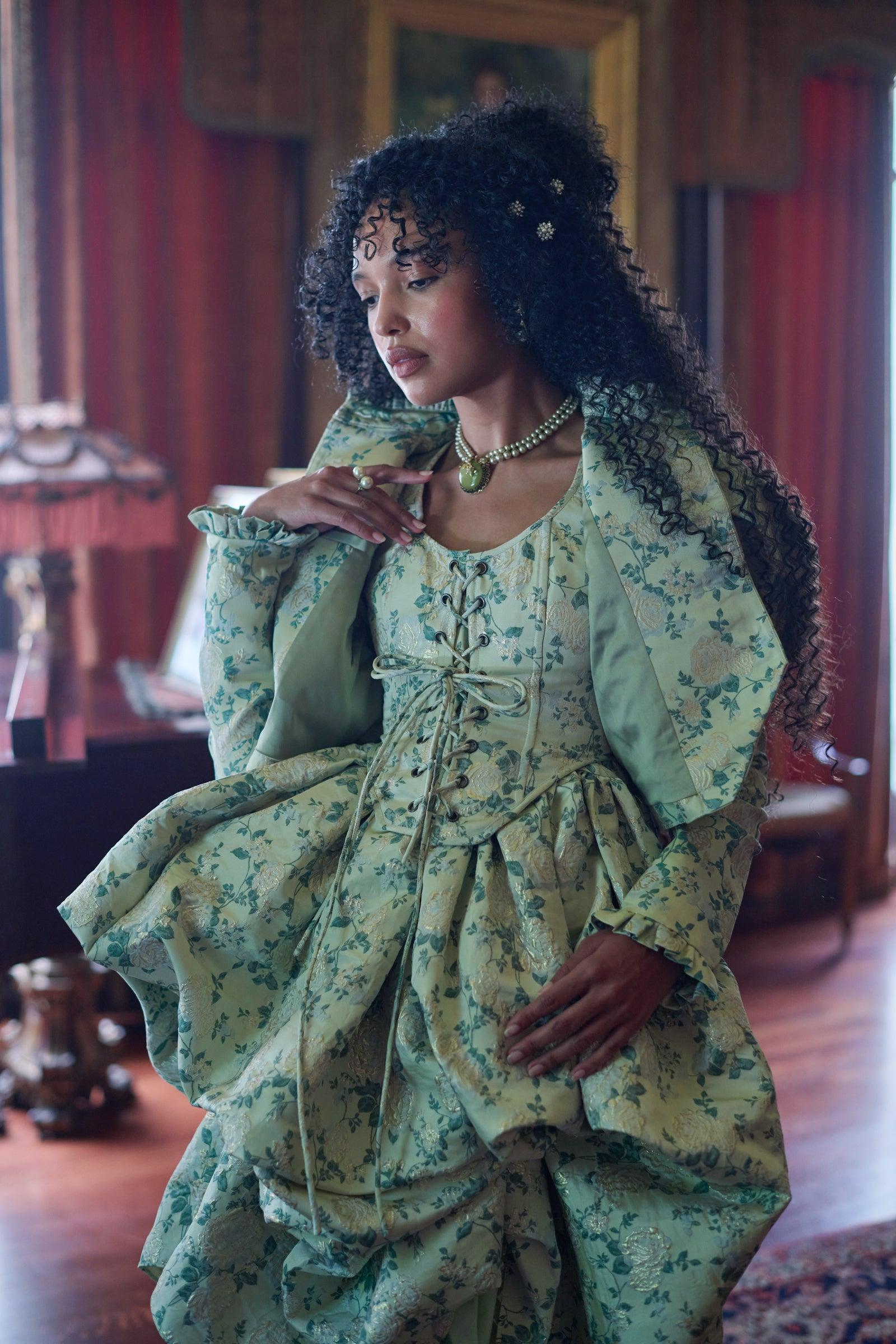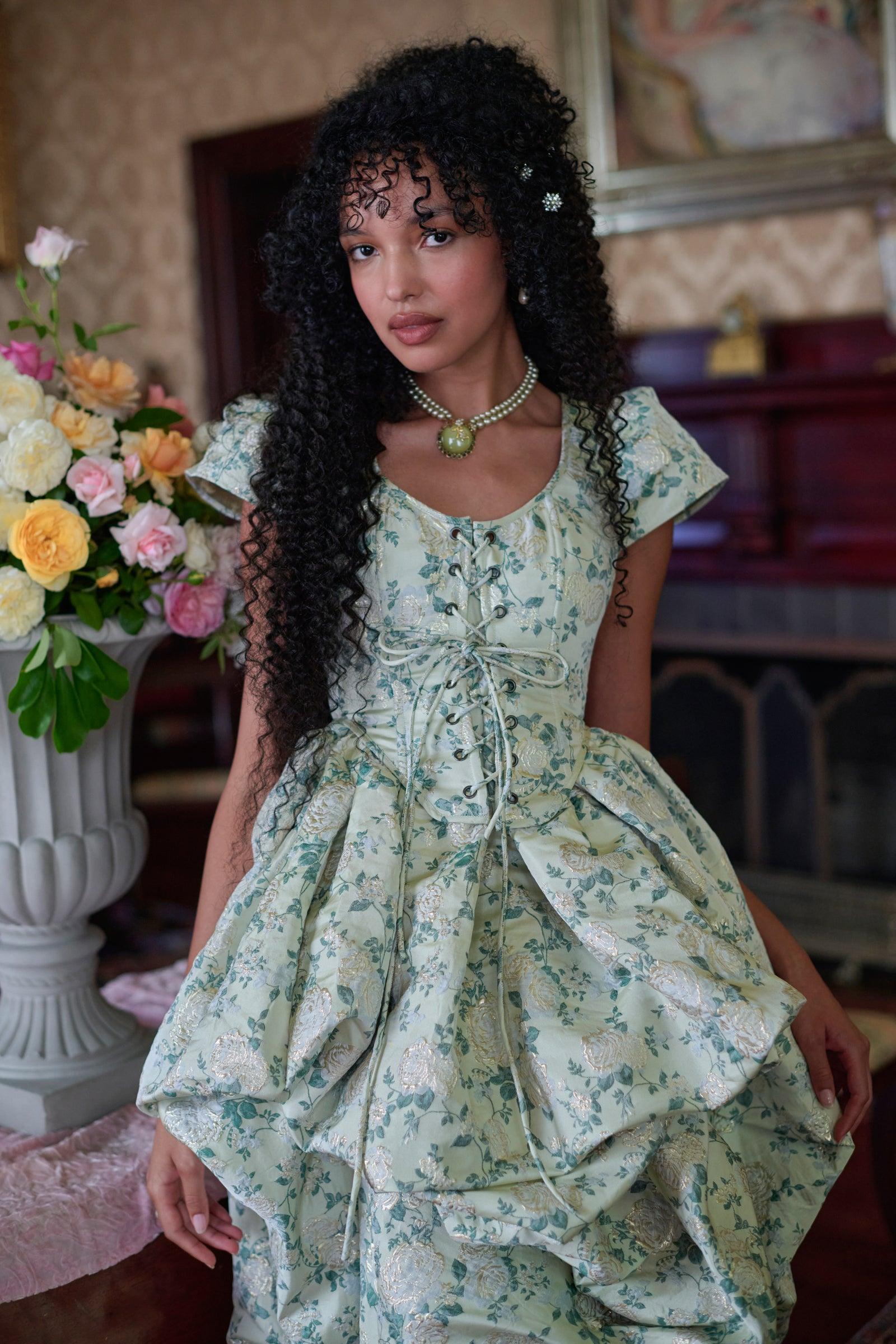 Become the talk of the ton in this exquisite brocade corset. Delicate floral vines intertwine across the fabric, rivaling the splendor of the finest English gardens. This fully boned corset and laces up with two draw chords, so that you can control the cinching effect to your desire. Style with the Eloise On A Cloud Dress and Bookclub Blazer to complete the look. Brocade lace-up bodice corset Includes two draw chords Boning for structure Lined with cotton To ensure the best fit, measure your across bust and high waist before ordering and steam for optimal beauty. Juliet is wearing a size 2X in Selkie. Fabric: 78% Polyester, 22% Lurex Lining: 100% Cotton